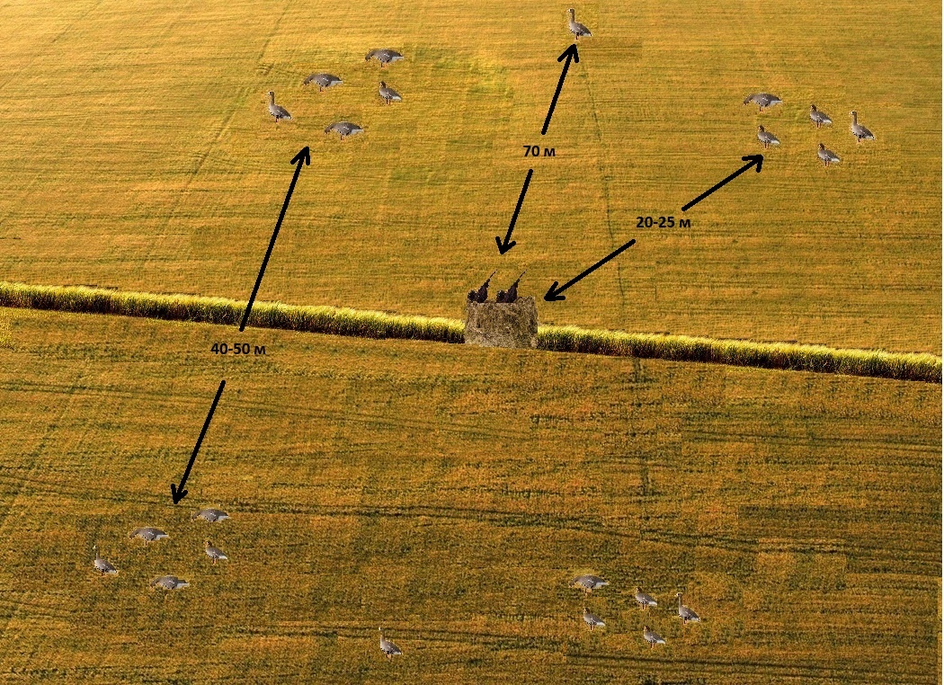 Подходит для шалашей, для стогов, для окопов или канав. Хорошо работает, когда есть обзор на 360 или на 180 градусов. Чаще всего такие схемы вместе со скрадками ставятся на краю поля или на полях где есть канавы. Работает эта схема от 24 чучел и больше. В правом верхнем углу чучела стоят на расстоянии 20-25 метров, в левом углу и за спиной все чучела ставятся на таком же расстоянии по диагонали. А между разными стайками чучел 40-50 метров. Это расстояние – «зоны посадки» мы оставляем из рассчета на посадку большой стаи. Смысл этой схемы заключается в том, что птица, пролетая вдалеке, видит довольно большую присаду. Такое впечатление создается за счет нескольких стай гусей, сидящих на большом расстоянии друг от друга. То есть какая-то большая стая, какой-то корм. Вы постоянно маните. Птица подлетает и выискивая откуда идет звук, пролетая между чучелами то и дело оказывается над скрадком. И вы стреляете. Простая схема, но есть несколько важных моментов. 1. Не нужно перемешивать чучела ра
