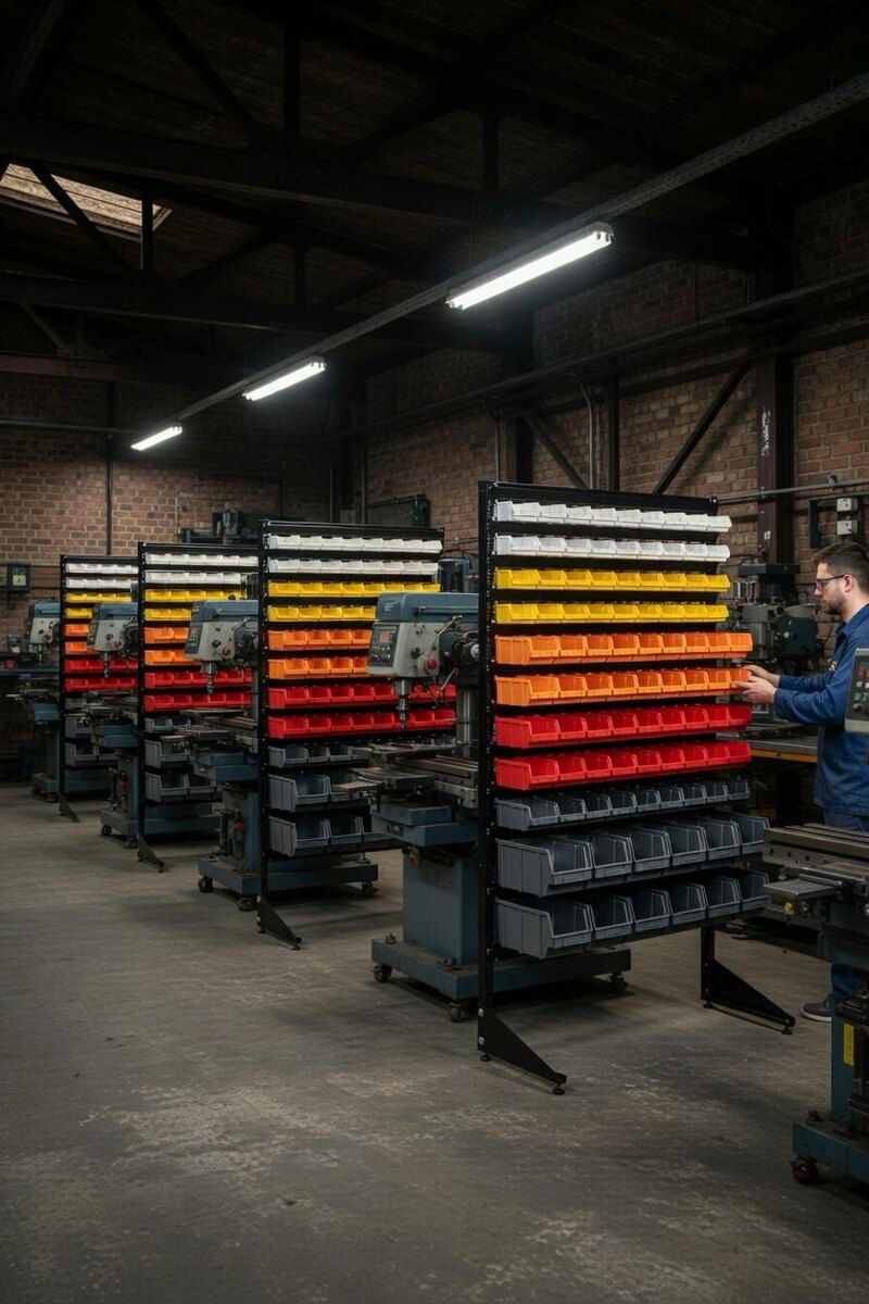 ⚙️ Стеллаж с пластиковыми лотками рядом со станком — это не роскошь, а рабочая необходимость в современном металлообрабатывающем цехе. Представьте типичный день инженера/наладчика: Нужно быстро найти сверло Ø8,2 под резьбу М10 Под рукой метчик М6×1, плашка, зенковка Концевые фрезы, зенкеры, развёртки — все в разных ящиках или навалом Мелкий крепёж (М5, М6, М8), шпонки, шайбы — ищутся по 3–7 минут Смазка, СОЖ, щётки, ветошь — тоже где-то рядом, но не под рукой Результат: потерянное время, раздражение, лишние движения, риск ошибок. А теперь с правильным стеллажом с лотками рядом со станком: Всё на уровне глаз и вытянутой руки — берёшь не глядя Цветовая кодировка: жёлтые — свёрла, красные — метчики/плашки, синие — фрезы, зелёные — крепёж Каждый типоразмер — свой лоток с подписью Поиск — 3–10 секунд вместо 3–7 минут Меньше наклонов, меньше хаоса на столе Чистота — стружка и СОЖ не попадают в лотки Инженер сосредоточен на задаче, а не на «где этот чёртов зенкер» Реальные цифры от цехов,