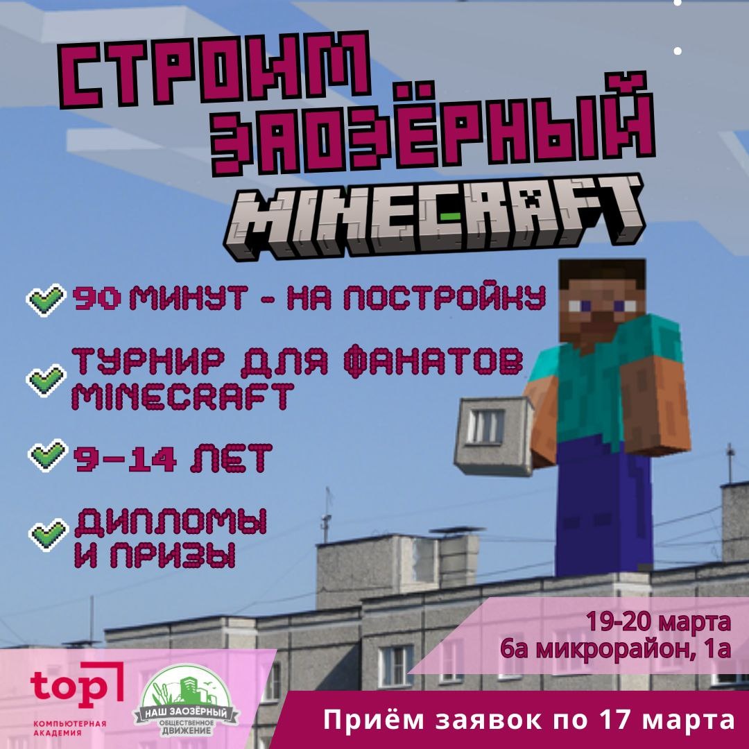 😍Компьютерная Академия ТОП и АНО «Наш Заозёрный» организуют третий турнир по строительству узнаваемых зданий района в популярной игре Minecraft. Ребятам предстоит за 90 минут воссоздать по одному из зданий Заозёрного. 🔘Кто может участвовать: дети от 9 до 14 лет. Когда: 19–20 марта (на выбор — 15:00 или 17:00). 🟣Где: 6а микрорайон, 1а (Академия ТОП). Регистрация: по ЭТОЙ ссылке. Участие бесплатное. ⭐️Участников ждут дипломы и подарки. Предварительная регистрация обязательна. Также нужно заполнить согласие для родителей (бланк в комментариях под постом организаторов). Заявки принимаются до 17:00 17 марта. Успевайте! 👾 Идём строить Зазик? 🎹 ⚡️Подписаться на ЗАЗИК 🔖Есть новость или фото района? 💬Напиши в личные сообщения канала