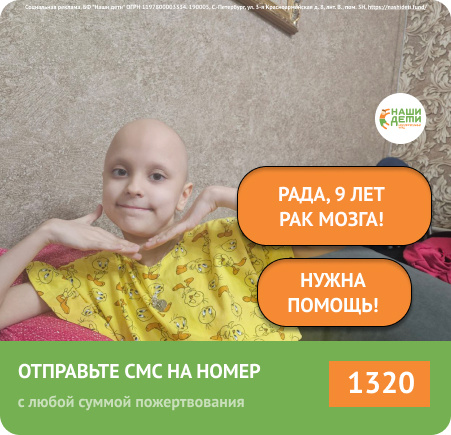 ПОМОЧЬ РАДОЧКЕ > Здравствуйте, дорогие помощники! У Радушки РАК мозга агрессивного типа. Даже день без лечения и контроля может стоить ей жизни. Этот РАК не даёт второго шанса. Единственное, на чём сейчас держится жизнь Рады, – это курс химиотерапии в НПЦ Солнцево. В конце февраля врачи отправили Раду домой для короткого восстановления после пройденного курса лечения. А маме это время дали для пополнения счёта клиники, чтобы дочь смогла вернуться и продолжить свою борьбу. Но случилось страшное. Дома показатели крови упали настолько, что пришлось срочно проходить стимулирующее лечение. Сейчас ситуация критическая: подошли сроки следующего курса химиотерапии, а денег для помощи маленькой девочке нет. Мама продала всё, что можно. Заняла у всех, кто мог дать. Рада мечтает вернуться туда, где ей могут помочь, где её жизнь на контроле врачей. Ей просто жизненно необходимо продолжать это лечение! РАК не будет ждать. Но мы можем успеть! Любая сумма помощи важна в этой страшной борьбе за жизнь!