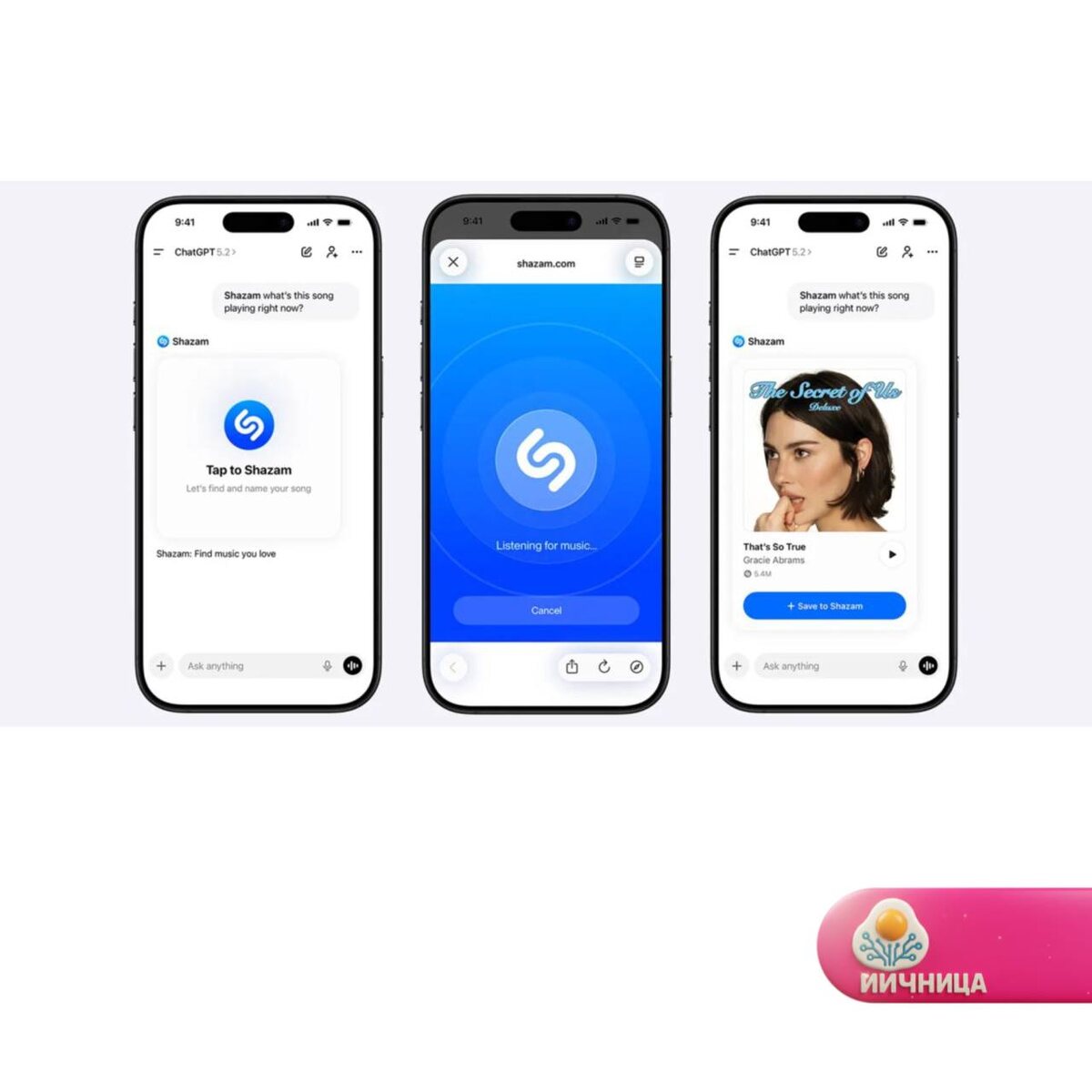 Чат-бота можно спросить: «Shazam, что играет?» и включить микрофон для распознавания песни. 📱 Мини-приложения внутри ChatGPT доступны бесплатно всем пользователям. Их начали добавлять в октябре 2025 года 📎Затестить @iicnica | ИИчница