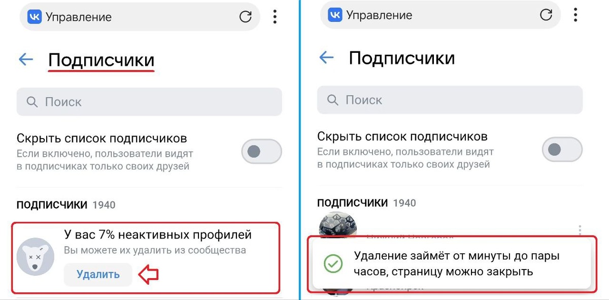 ? 1. Откройте настройки сообщества. 2. Перейдите в раздел «Подписчики». 3. Перед первым подписчиком вы увидите информацию о количестве неактивных профилей (заблокированных и удалённых), а также кнопку «Удалить». Нажмите на неё, неактивные профили исчезнут через несколько минут или часов. Источник