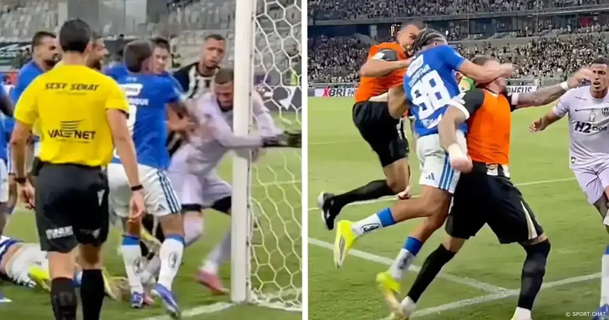Финальный матч чемпионата штата Минас-Жерайс между «Крузейро» и «Атлетико Минейро» завершился громким скандалом и массовой дракой. Встреча закончилась победой «Крузейро» со счётом 1:0, однако главным событием стал конфликт, вспыхнувший уже после игры. По данным бразильских СМИ, после дерби в Белу-Оризонти арбитр показал дополнительные красные карточки, и в общей сложности их число достигло 23. Инцидент произошёл на 97-й минуте в штрафной площади «Атлетико Минейро». После столкновения между полузащитником Кристианом и голкипером хозяев Эверсоном ситуация резко обострилась. Вратарь отреагировал крайне эмоционально — сначала толкнул соперника, а затем повалил его на газон. После этого началась масштабная потасовка между игроками обеих команд. Позднее в сети появилось новое видео инцидента, снятое с близкого расстояния. На кадрах отчётливо видно, как конфликт быстро перерастает в массовую драку, в которой участвуют футболисты и представители обеих команд.