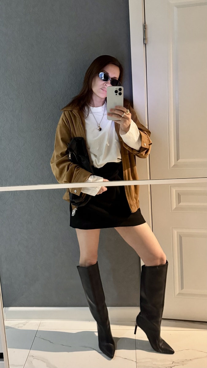 - Высокие замшевые сапоги карамельно-коричневого оттенка — создают интересный контраст с курткой.