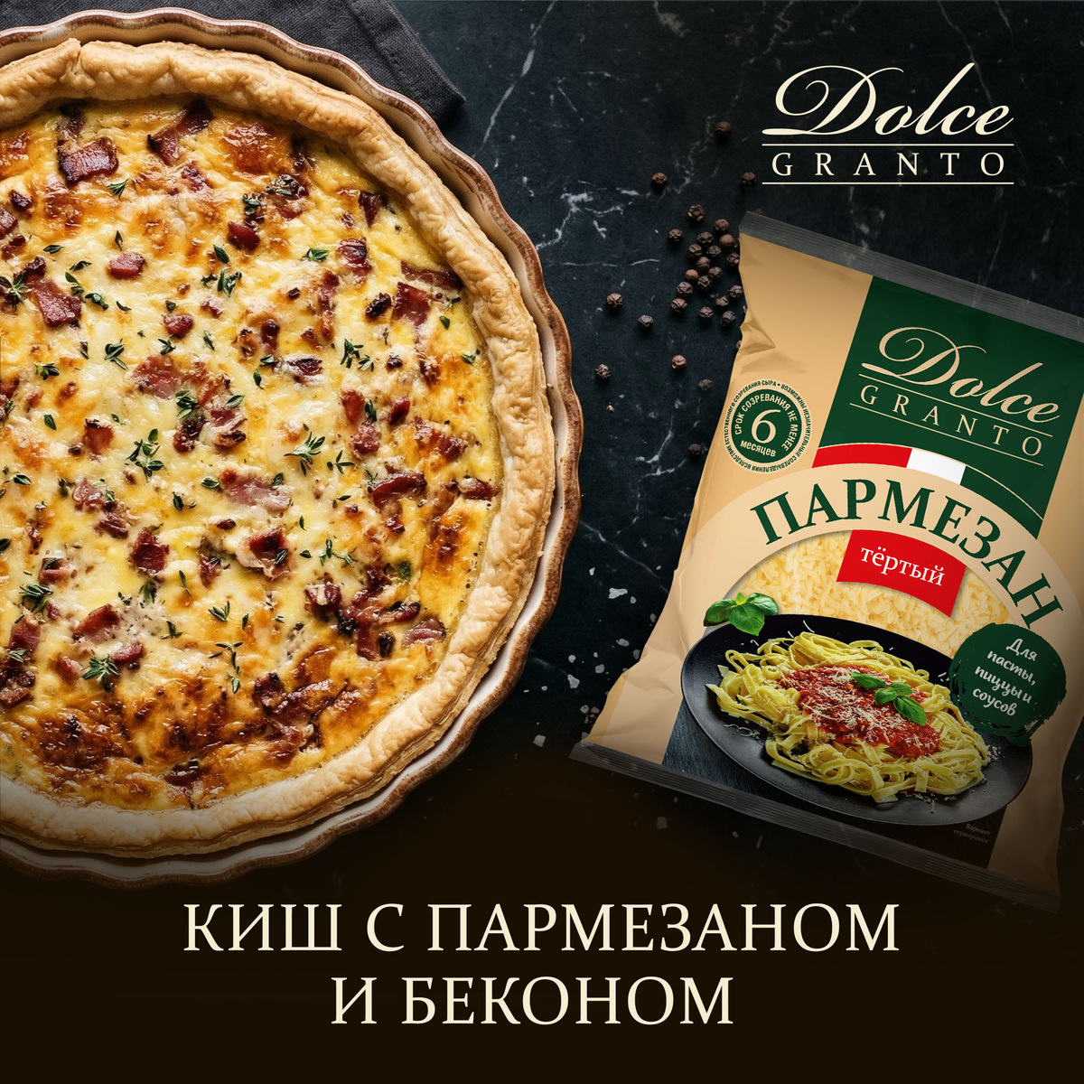 Иногда хочется блюда, которое одновременно сытное, вкусное и уютное. Киш с пармезаном и беконом именно такое. Хрустящая песочная основа, нежная сливочная заливка, насыщенный бекон и тот самый ароматный пармезан Dolce Granto, который делает блюдо незабываемым. Это идеальный вариант для семейного ужина или небольшого фуршета — просто, быстро и с ощущением праздника. Пармезан добавляет глубину вкуса: он подчеркивает солёность бекона, связывает сливочную заливку и создает легкую золотистую корочку сверху. Ингредиенты (форма 22–24 см): Шаг 1: Смешайте муку с солью и с нарезанным кубиками холодным маслом. Перетрите в все крошку, добавьте яйцо и быстро замесите тесто. Сформируйте шар, уберите в холодильник на 30 минут. Шаг 2: Бекон нарежьте и обжарьте до золотистой корочки. В миске взбейте яйца со сливками, добавьте тертый пармезан, перец и мускатный орех. Шаг 3: Раскатайте тесто, выложите в форму с бортиками и слегка подпеките 10–12 минут при 180 °C. На основу выложите бекон, сверху аккуратн
