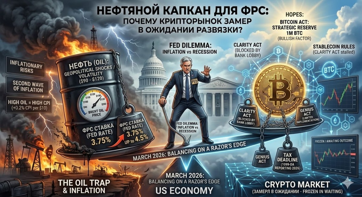 Экономика США в марте 2026 года находится в фазе «балансирования на лезвии бритвы». ФРС вынуждена выбирать между купированием инфляционных рисков и предотвращением рецессии на фоне крайне нестабильных цен на энергоресурсы. 1. Текущая ситуация и планы ФРС. На мартовском заседании (18 марта 2026 г.) ожидается, что ФРС сохранит ставку на уровне 3,5–3,75%. ➖Дилемма ФРС: Регулятор взял паузу в цикле снижения. Дальнейшее смягчение политики сейчас заблокировано риском «второй волны» инфляции, которую подпитывает геополитическая нестабильность. ➖Инфляция: ФРС прогнозирует снижение цен в течение года, но рынок начеку: рост нефти на каждые $10 за баррель традиционно добавляет около 0,2% к CPI. ➖Прогноз на 3–5 месяцев: При стабильной инфляции рынок ждет снижения ставки до 2,13–3,0% к концу года. Однако при эскалации конфликтов ставка может быть экстренно поднята до 4,5%. 2. Фактор нефти. Нефть остается главной «гирей» на мировых весах. ➖Оптимистичный сценарий: Прогнозы JP Morgan и Минэнерго США у