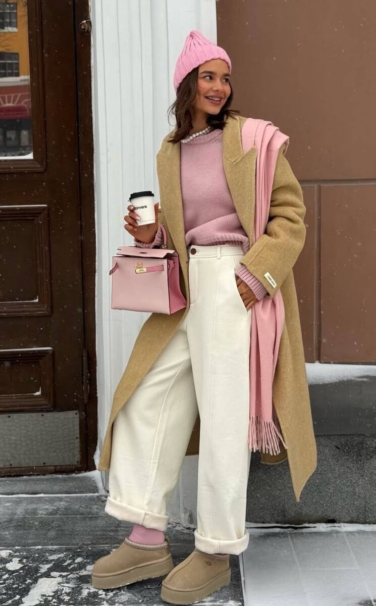 Этот образ — идеальный пример того, как весной можно выглядеть свежо, женственно и при этом очень расслабленно. Здесь прекрасно работает цветовая палитра. 🤍Бежевое пальто создаёт спокойную и дорогую базу, а нежно-розовый свитер, шапка и шарф добавляют мягкости и лёгкого весеннего настроения. 🤍Белые брюки делают образ светлее и визуально освежают его. Обратите внимание на посадку — высокая талия и слегка свободный крой создают современный силуэт и добавляют лёгкости. 🤍Аксессуары здесь играют важную роль. Розовая сумка поддерживает цветовую линию образа. Даже шапка в этом комплекте выглядит не спортивно, а очень стильно — за счёт цвета и сочетания с классическим пальто. 🤍И ещё один интересный момент — обувь. Мягкие бежевые угги добавляют образу комфорта и делают его более повседневным, что сейчас очень актуально: мода всё чаще соединяет эстетику и удобство. Что можно взять на заметку из этого образа: — сочетание бежевого и розового всегда выглядит свежо и дорого; — светлый низ