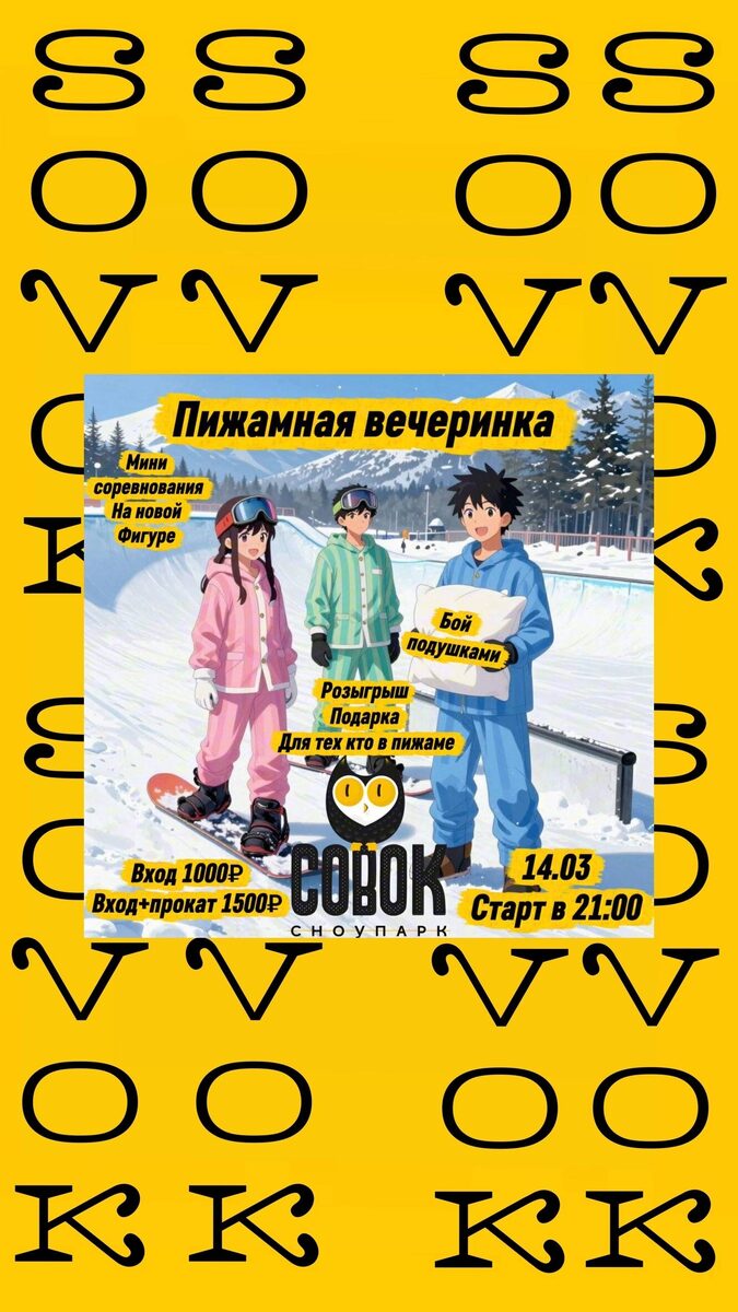 Приглашаем на пижамную вечеринку на склоне. Надевайте смешные и уютные пижамы, катайтесь на сноубордах и лыжах под музыку. Это последнее вечернее катание сезона, не пропустите! Начало: 14 марта 2026 21:00 Стоимость: От 1000.0 руб. до 1500.0 руб. Адрес: г Омск, ул Андрианова, д 1 Организатор: https://vk.com/public189830378 14 марта в 21:00 в Сноупарке Совок будет пижамная вечеринка на склоне 💤🏂 Надеваем самые смешные, уютные и безумные пижамы и приезжаем кататься. Будет весело, громко и по-домашнему — как будто ночёвка у друзей, только на сноубордах и лыжах. И есть ещё одна причина не пропустить: скорее всего, это будет последнее вечернее катание этого сезона. Поэтому давайте красиво проводить зиму — с катанием, музыкой, смехом и пижамами. Берите друзей, надевайте... #лыжный_спорт_сноуборд #лыжный_спорт_горные_лыжи Узнать подробности, адрес или записаться на событие.