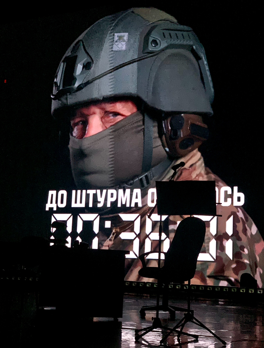 Все массовые сцены мы видим видеопроекцией на экране. Постановка выглядит симбиозом спектакля, кино и концерта.