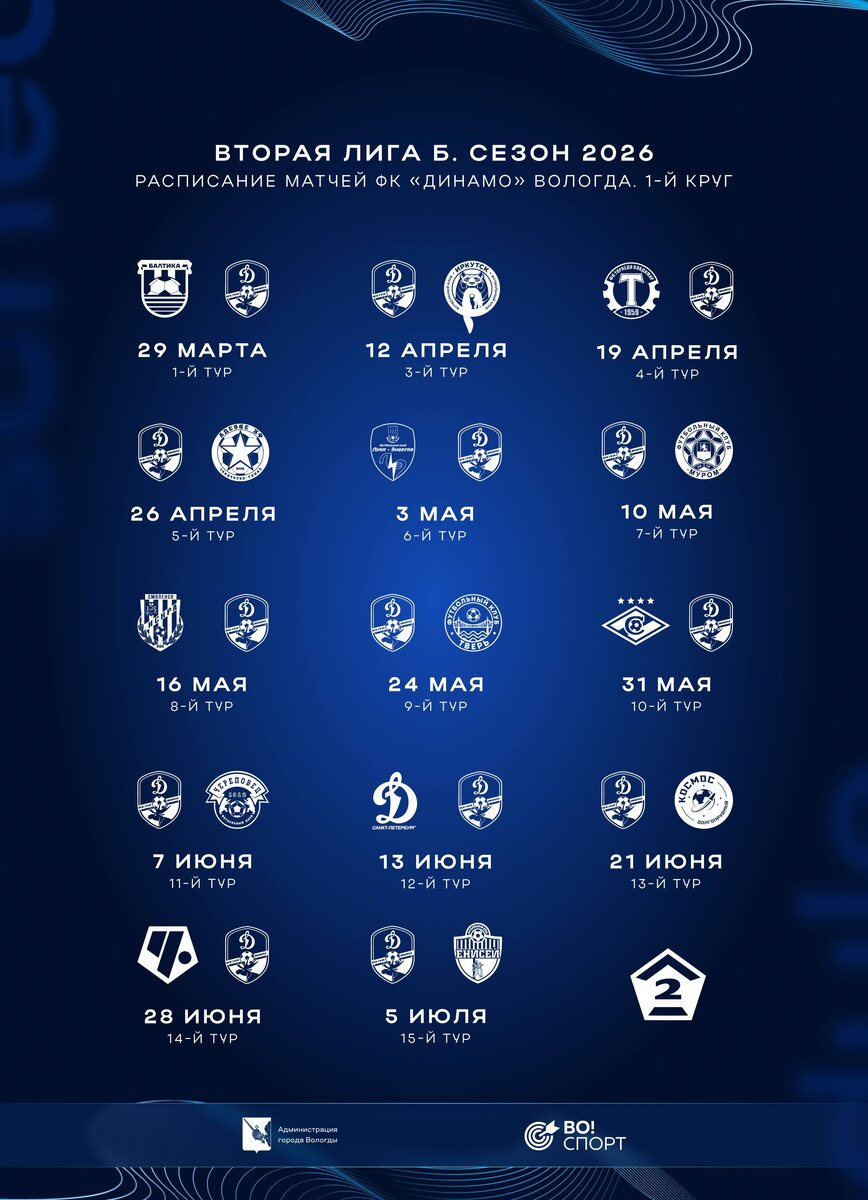 ! ❕В новом сезоне сыграют 15 команд. Динамовцы пропустят 2 и 16 игровой тур. Старт намечен на 29 марта. Турнир пройдет в два круга. Первый матч бело-голубые проведут в гостях. Соперник — «Балтика-2» (Калининград) @dynamovologda
