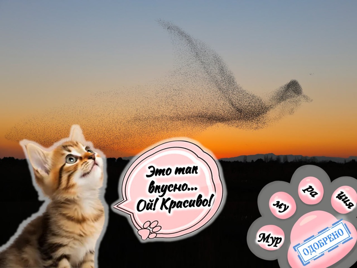 ! 🐈Впервые услышав это слово (а именно знакомое «мур-мур»), человек представляет забавные картинки с участием играющихся пушистых котиков. Но на самом деле «мурмурация» – это зоологический термин, обозначающий синхронный полёт больших стай птиц (скворцов, ворон и др.). Небесный танец исполняется под шелест тысяч крыльев. 🦅Быстрые движения (до 50 км/ч), отсутствие ведущего партнёра, создание сложных художественных фигур и, как правило, единственная цель – спастись от воздушных охотников (ястребов-перепелятников, соколов или луней). – Как маленькой птичке защитить себя? – Стать больше? – Каким образом? – Позвать друзей! 🐦⬛️Метод рабочий! Девизом мурмурации служит народная мудрость: «В одиночку – уязвимы, вместе – защищены»! Хищная птица последует инстинкту самосохранения, но даже если она попытается напасть, выхватить одну птицу из множества синхронно перемещающихся будет непросто. 🧐Вам приходилось вживую видеть птичью мурмурацию? Если да, ставьте 😎! #природабрянщины