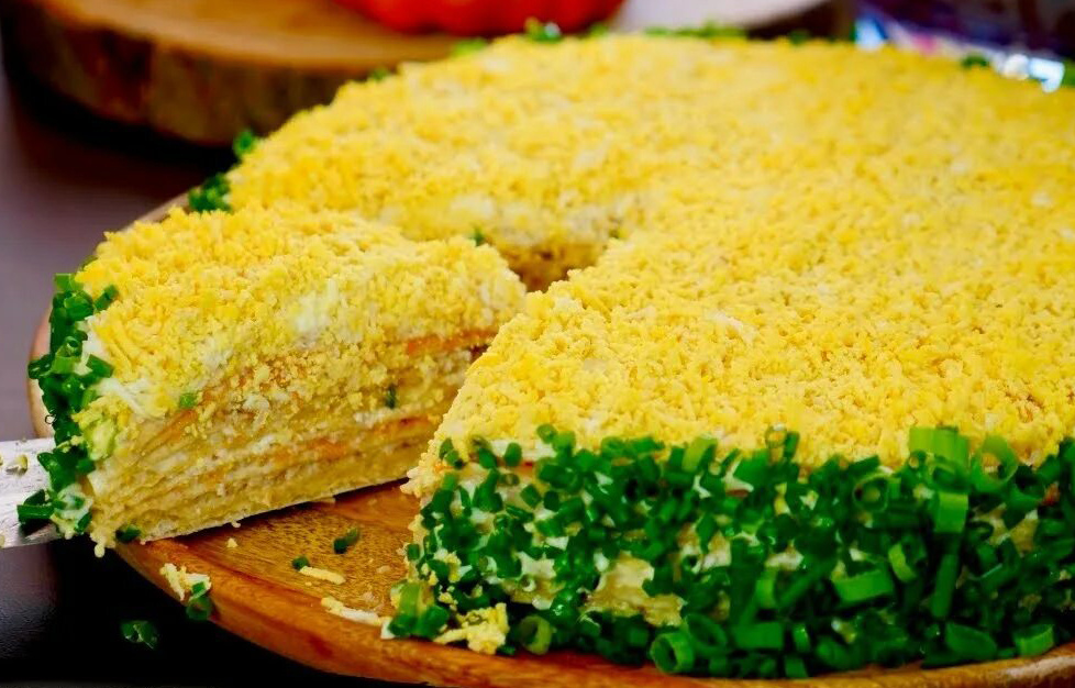 Повар-кондитер Ирина Симоненко делится своим вариантом этого популярного рецепта и утверждает, что это очень вкусно! Ингредиенты для слоев: 3 вафельных коржа (прямоугольные), 250 г консервированной горбуши, 40 г тертого сыра, 1 луковица, 1 морковь, 3 яйца, майонез, зелень (петрушка, укроп, зеленый лук). Для маринада: 120 г яблочного уксуса, 100 г сахара, щепотка соли. Яйца варим вкрутую и помещаем на 2-3 минуты в холодную воду. Затем очищаем от скорлупы и разделяем на белки и желтки, которые затем по отдельности мелко рубим или разминаем вилкой. Морковь моем, отвариваем «в мундире», чистим и натираем на крупной терке. У консервированной рыбы удаляем косточки, мякоть разминаем вилкой. Зелень нужно мелко порубить. Снимаем с лука шелуху, мелко нарезаем и складываем в миску. Для маринада смешиваем уксус с сахаром и солью и слегка прогреваем до растворения сахара. По вкусу должна получиться насыщенная пикантно-сладковатая смесь. Заливаем подготовленный лук горячим маринадом и даем ему насто