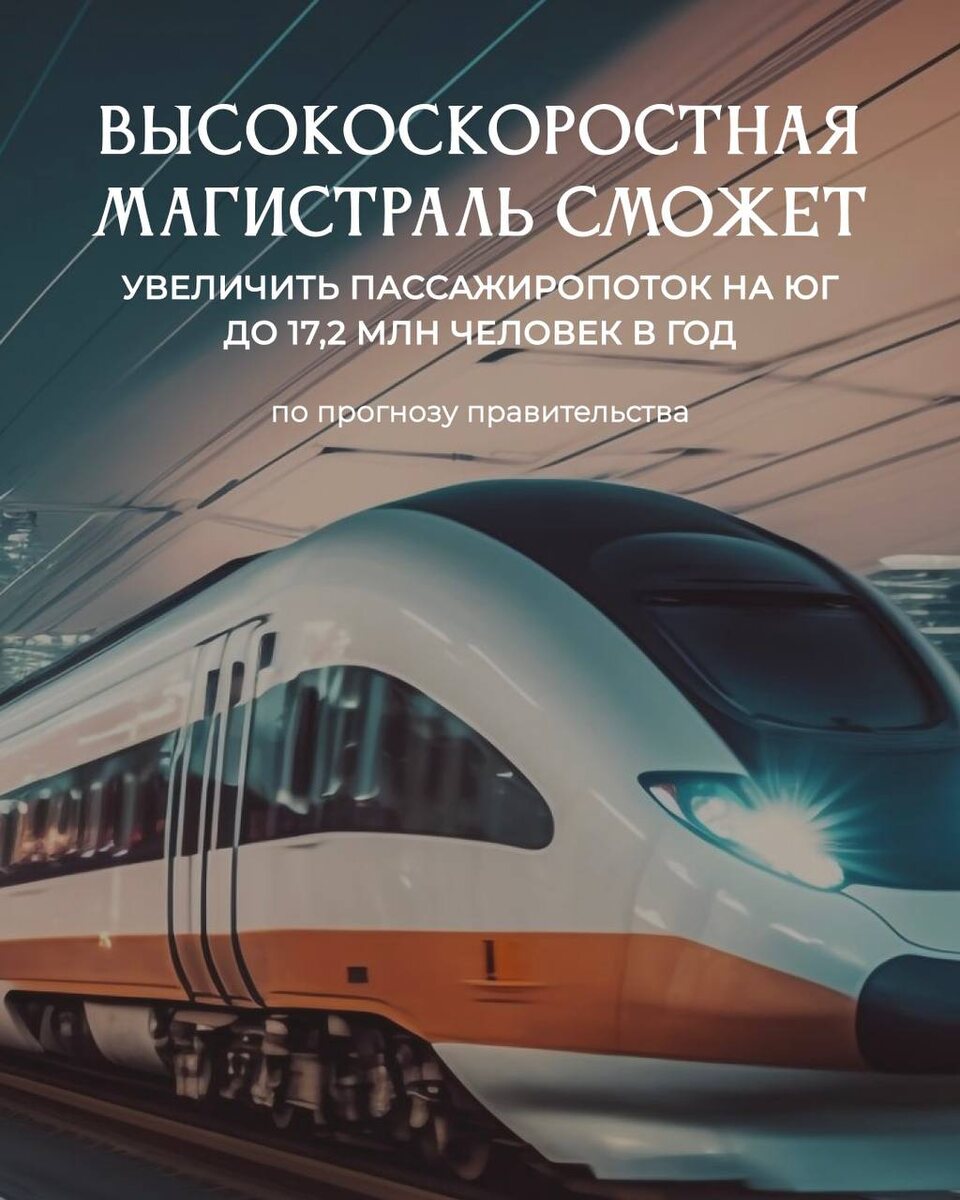 Российские железные дороги представили обновлённые материалы по проекту высокоскоростной железнодорожной магистрали от Москвы к Черноморскому побережью. Об этом сообщает РИА Новости со ссылкой на материалы, представленные на форуме Транспорт России. 🚂 По проекту движение пассажирских поездов на новой линии будет осуществляться со скоростью до 400 км/ч. Высокоскоростная магистраль протяжённостью более 1,5 тыс. км позволит значительно сократить время в пути между Москвой и Черноморским побережьем — с нынешних 23 часов до 7 часов 50 минут. Маршрут предполагает остановки в ряде крупных городов, включая: — Воронеж — Ростов-на-Дону — Краснодар — Ставрополь — Туапсе — Сочи — а также другие города. Ранее Владимир Путин отмечал, что строительство высокоскоростной магистрали на юг является реальной задачей. По его словам, проект позволит увеличить пропускную способность железных дорог, снизить нагрузку на аэропорты и стимулировать внутренний туризм. В Министерство транспорта Российской Фед