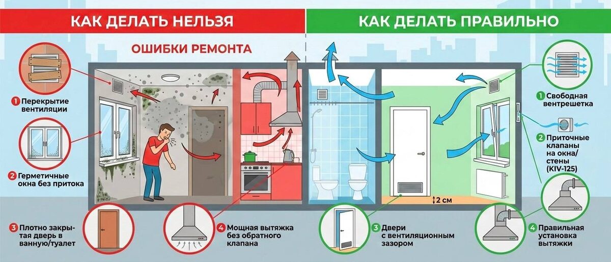 Раньше воздух поступал через щели в старых окнах и уходил в вентрешётку. Вы поставили герметичные стеклопакеты — притока нет. Вытяжка не работает. В квартире — вакуум. Влаге, запахам и углекислому газу деваться некуда. Они остаются с вами.