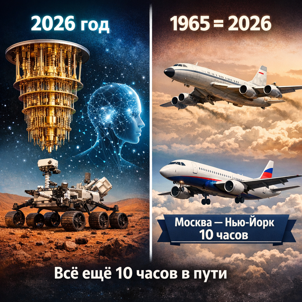 Мы живём в 2025 году, у нас есть нейросети, квантовые компьютеры и роверы на Марсе. Но перелёт из Москвы в Нью-Йорк занимает столько же времени, сколько в 1965 году. Примерно 10 часов. Десять. Часов.