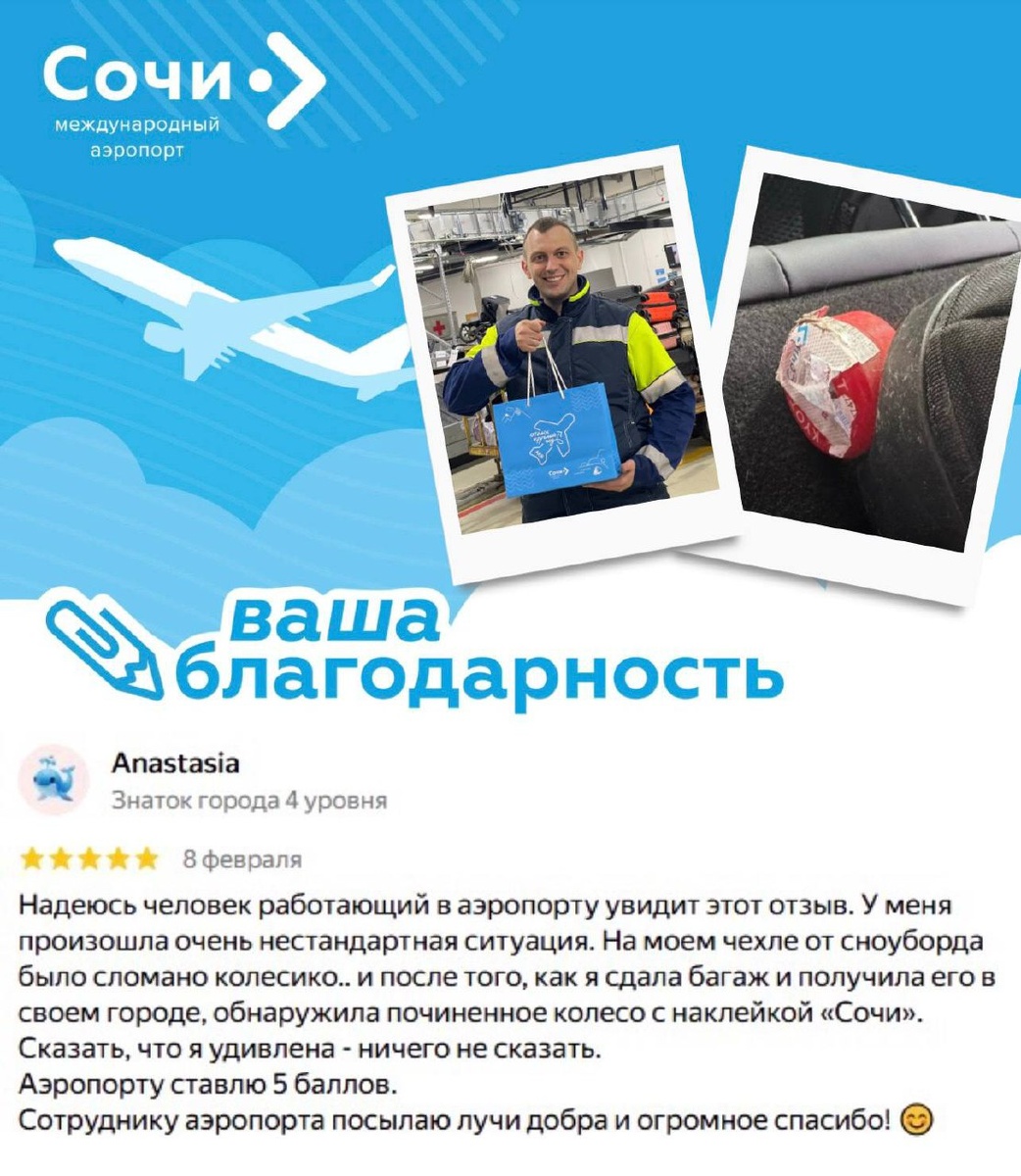 ✨ ✈️Мы заметили удивительный отзыв от Анастасии: она сдала в багаж сноуборд со сломанным колесом на чехле, а по прилете обнаружила его... полностью исправным! 🛠️ Как мы выяснили, наш сотрудник Дмитрий Адушкин заметил поломку и нашел время, чтобы её устранить!💖 Такие маленькие добрые дела делают нашу жизнь светлее и доказывают, что работа - это не всегда только четкое выполнение должностных инструкций, но и искренняя человечность и внимание к деталям! 💭 Анастасия, спасибо за обратную связь! Мы поблагодарили Дмитрия за проявленную им доброту и пожелали не растерять это чувство. 🫴 Кто воодушевлён поступком нашего сотрудника - ставьте ❤️