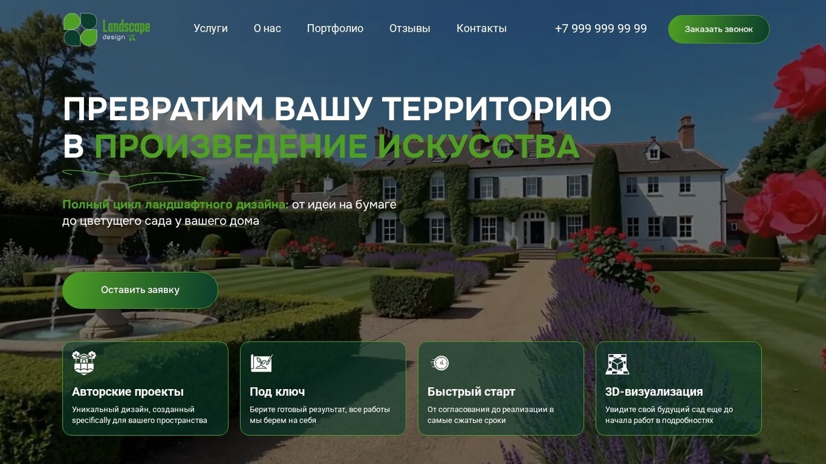 Готовый шаблон для сайта студии ландшафтного дизайна «Полный цикл: от идеи до сада вашей мечты»