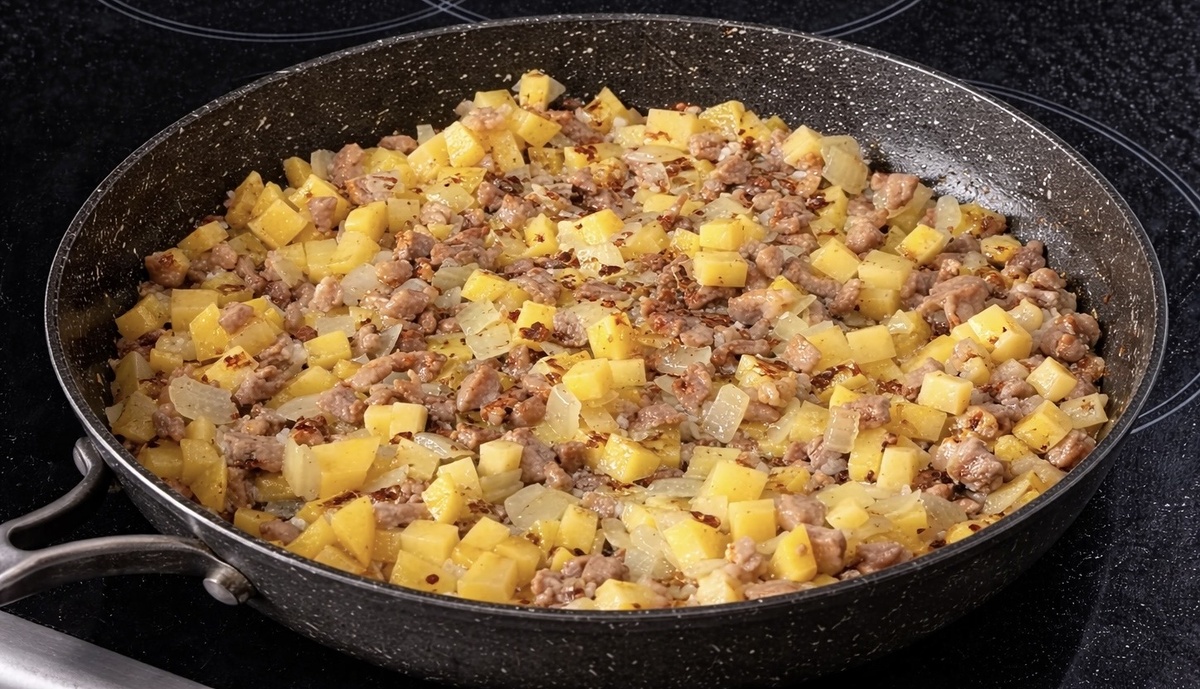 Разогреваем сковороду и обжариваем всё вместе примерно 3–5 минут на среднем огне. Наша задача — не полностью приготовить начинку, а лишь слегка «схватить» её и раскрыть аромат. В этот момент добавляем: