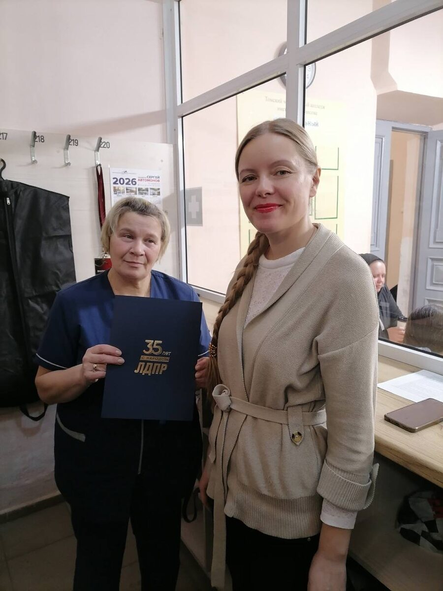 Активист Томского регионального отделения ЛДПР Снежана Руденко лично поздравила Марину Александровну Довыденко, отметив её высокий профессионализм и значительный вклад в общее дело. Снежана Руденко вручила Марине Александровне благодарственное письмо, подчеркнув её ответственность, трудолюбие и стойкость при выполнении рабочих задач.