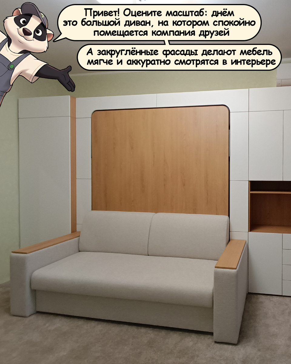 Наши клиенты на Щербаковской долго жили в обычной схеме: кровать + шкаф. И всё. — гостей нормально не позвать — поработать негде — половина комнаты занята одной кроватью В какой-то момент стало понятно: 18 метров используются максимум наполовину. Мы полностью переиграли пространство. Теперь в той же комнате есть сразу 4 зоны: 🛋 гостиная с большим диваном 🛏 полноценная кровать 180×200 💻 рабочее место 🧥 мини-гардеробная И самое приятное — в комнате появился воздух. Подоконники освободились, вещи разложены по местам, а поддерживать порядок стало гораздо проще. ✨ Как всё это удалось уместить в один проект? Наш Барсук разобрал основные фишки этой мебели. Листайте карусель — покажем по шагам. 👇