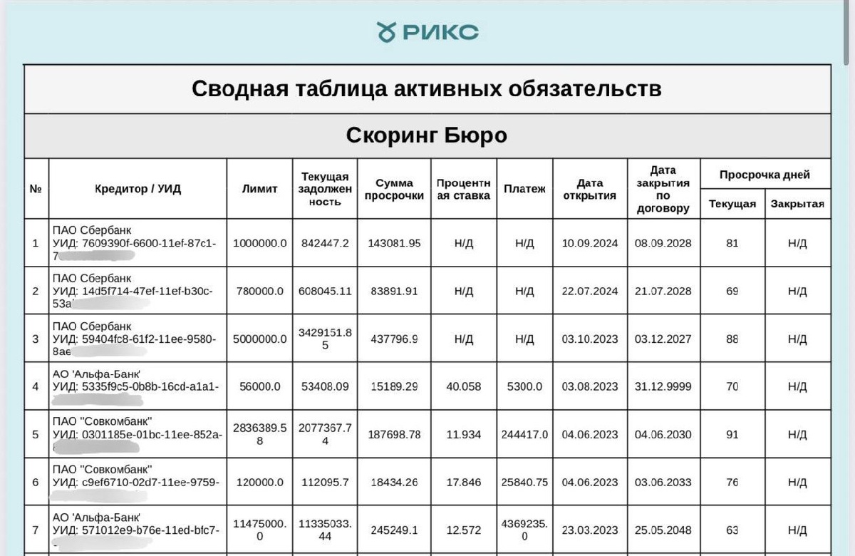 Хорошая рекомендация начинается не с догадок, а с полной картины по клиенту. Поэтому мы добавили в отчёт сводную таблицу по всем 3 бюро кредитных историй, где собраны все активные обязательства клиента в одном месте. Что это даёт специалисту: 1. Больше объективности Мы не пытаемся угадать, какое бюро “главнее”. РИКС сводит данные из всех трёх бюро кредитных историй в единую картину. Если по одному и тому же договору в разных бюро совпадают просрочки, суммы и статус — это подтверждённый факт. Если данные расходятся — это уже сигнал, что нужно проверять глубже. 2. Меньше ручной работы Больше не нужно перелистывать десятки страниц отчёта, чтобы понять, что происходит с клиентом. Теперь вы сразу видите: — все активные обязательства — хронические просрочки — повторяющиеся паттерны поведения — точки, которые требуют внимания в первую очередь 3. Быстрее консультация По сути, вы получаете готовую матрицу обязательств клиента. Это помогает быстрее разобраться в ситуации, принять решени