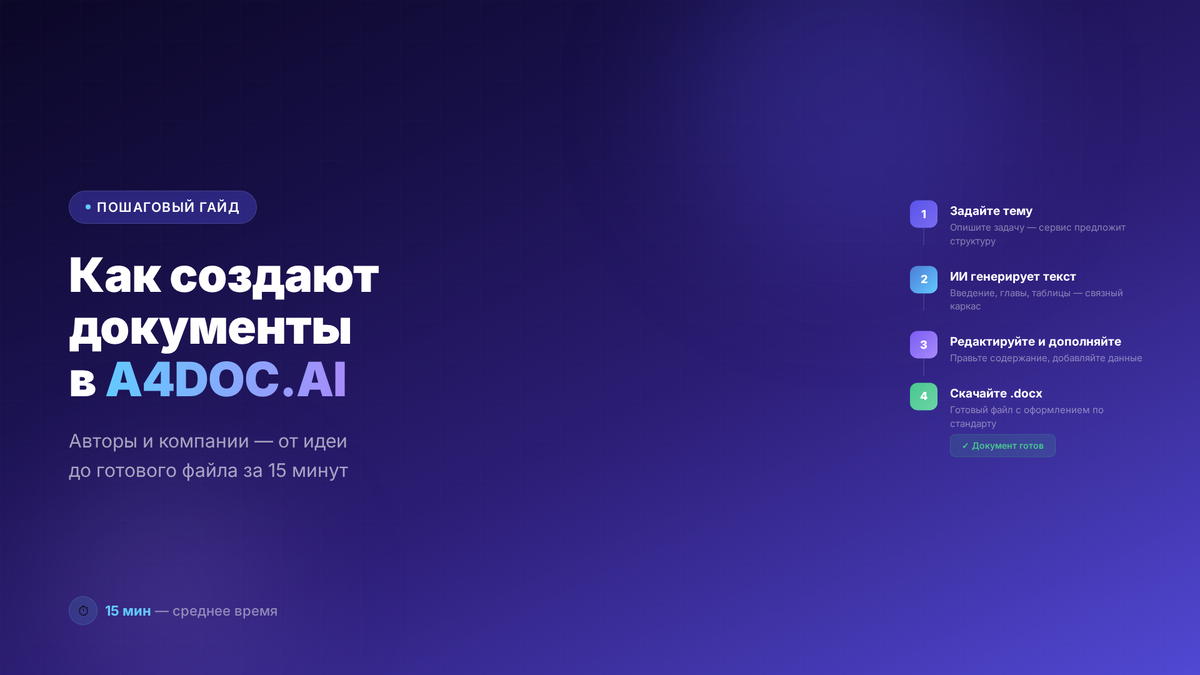 Когда в почте лежит ТЗ, дедлайн «на вчера», а файл с документом всё ещё пустой — это не про лень, это про отсутствие нормального инструмента. Ниже разберём, как авторы и компании собирают в A4DOC.AI аккуратный документ за 15 минут — от пустого поля до .docx, который не стыдно отправить заказчику. Дочитай до конца, там чек‑лист, как повторить это у себя. Что делает сервис: на основе запроса он понимает, что вы хотите не просто текст «про тему», а структурный документ, и готовит под это каркас. Минута 1–3. A4DOC.AI предлагает структуру: На этом этапе авторы обычно: Минута 3–6. Чтобы ИИ не писал абстракцию, важно дать ему «мясо»: Чем конкретнее вводные — тем меньше потом переписываний. A4DOC.AI использует эти данные при генерации текста для каждого раздела. Минута 6–11. Дальше авторы и команды идут сверху вниз: То же самое — с остальными разделами: «Ход работ», «Результаты», «Выводы». Можно попросить: Минута 11–13. Чтобы документ выглядел профессионально, авторы почти всегда используют с