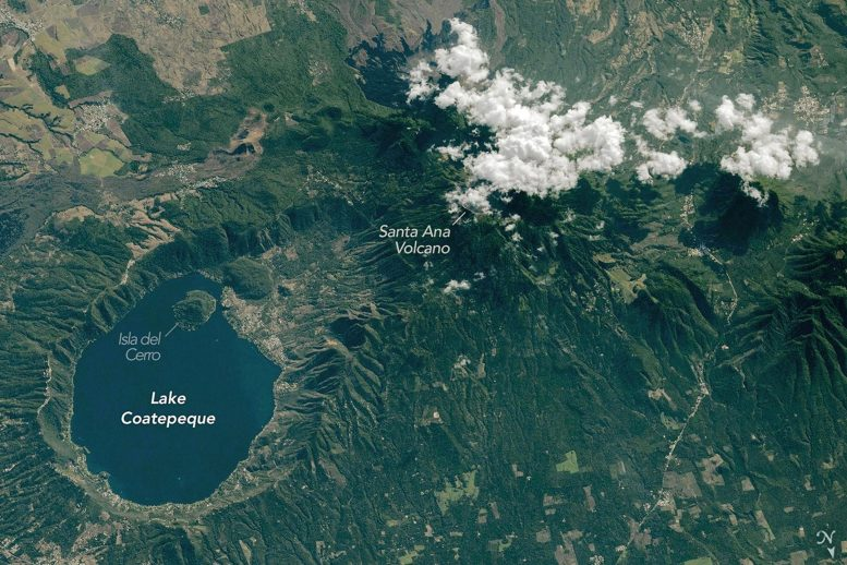 Кальдера Коатепеке (Coatepeque Caldera) возникла в результате серии мощных извержений между 70-50 тысяч лет назад. Позже на западном крае образовались лавовые (вулканические) купола. Один из них стал островом Исла-дель-Серро (Isla del Cerro), также известным как Исла-Теопан (Isla Teopán), который виден на поверхности озера. По данным Смитсоновского института (Smithsonian Institution, США), последние 11 тысяч лет вулкан не проявлял активности. Изображение: scitechdaily.com На берегах озера построили дома, причалы и рестораны. К востоку от водоема находится вулкан Санта-Ана (Santa Ana Volcano), который является самым высоким в Сальвадоре. Он действующий. Последнее сильное извержение было в уже далёком 2005 году. До этого небольшие выбросы фиксировали с XVI века. На фото с МКС вода темно-синяя, но иногда озеро становится бирюзовым. В 2024 году ученые выяснили, что отчасти на цвет влияют пигменты от микроводорослей и цианобактерий. Однако главная причина смены оттенка, скорее всего, кроетс