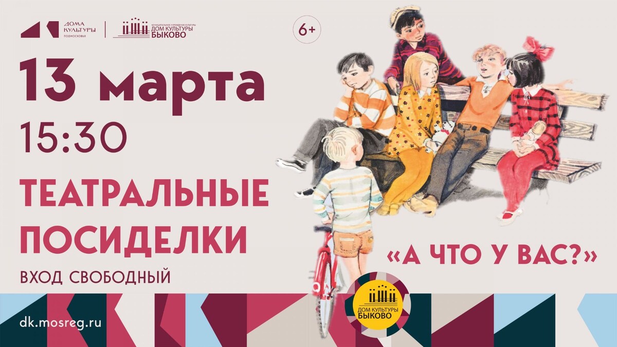 ✨ ТЕАТРАЛЬНЫЕ ПОСИДЕЛКИ "А ЧТО У ВАС?" 🗿Формат мероприятия предполагает дружескую атмосферу и свободное выражение эмоций через актерское мастерство, сценическое движение, импровизацию и драматургию. 🔉Участники получают возможность выступить перед публикой с собственными историями, стихами или миниатюрами, а также насладиться выступлениями других участников. 🚫 Возраст: 6+ 📆 13.03.2026 🕒 15:30 🏢 Дом культуры «Быково» 📍 Московская обл., г. Подольск, п. Быково, ул. Школьная, д. 8 💰 Вход свободный❗️ ⭐Поддержать канал голосом 🍰Где поесть в Подольске ✅ Мероприятия Подольск https://dzen.ru/id/66ed500f7b5671493eca3fd6 https://vk.ru/podolsk_events http://dzen.ru/podolsk_events