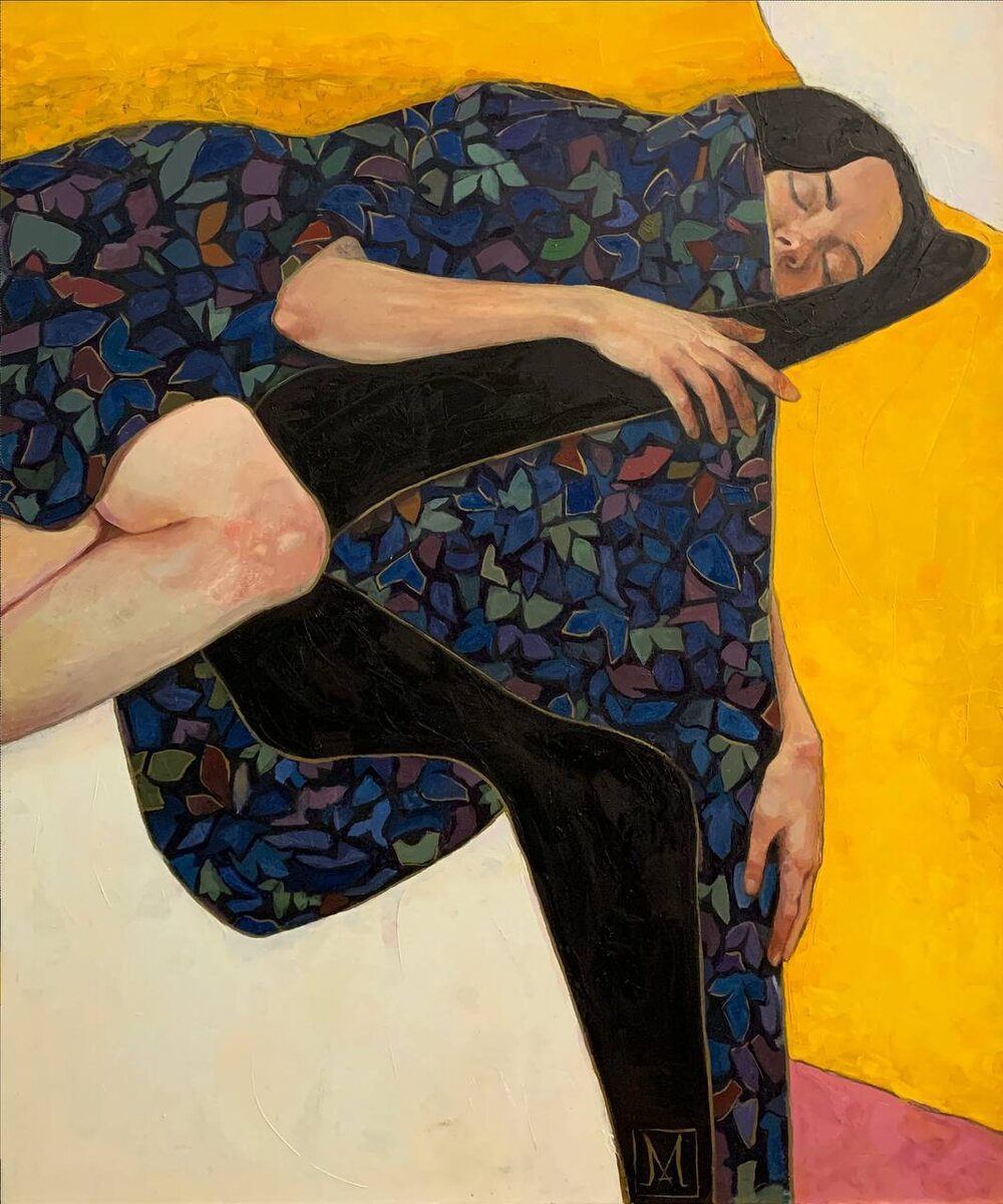 » холст, масло | 120x100 см I 2024 г. Холст входит в цикл работ «Музы». Яркая и красочная, эта серия посвящена ничем не омраченному оптимизму юности. Авторский цветочный орнамент, который, кстати, Артур Мирзоян использует только в этой серии, небрежно накинут на её фигуру большим шелковым платком. Фон картины решен крупными абстрактными пятнами. Этот приём даёт свободу в интерпретации сюжета: не исключено, что диковинные цветы и шафран летнего солнца снятся героине среди зимы. Роскошные волосы девушки свободно струятся за пределы холста, олицетворяя здесь нечто подсознательное, глубину и таинственность её цветных снов. Картина доступна к приобретению #АртурМирзоян