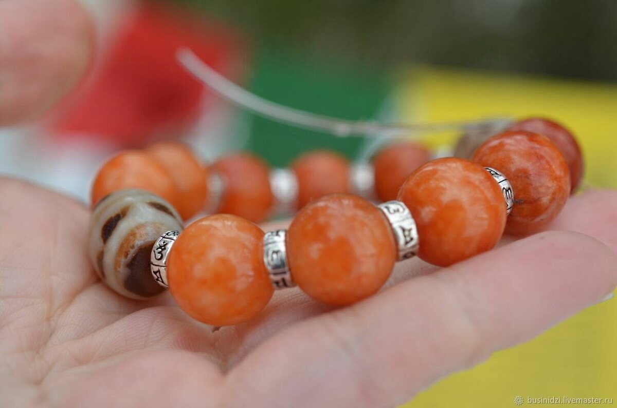 Сами камни - крупные сочные будто светящиеся, агаты, винтажные бусины привезенные из другой знаковой поездки - из Малого Тибета, вставки с шестислоговой мантрой Будды Сострадания и Две бусины ДЗи которые были привлечены в поездке на Лосар в Непал в 2026 году, то есть совсем совсем недавно. Браслет благословлен на нескольких пуджах, а так как пуджи (службы в храмах) все направлены на мощное привлечение удачи на целый год, то в этом изделии действительно многоуровневый свет! Две бусины: защитные зубы тигра, талисман силы воли и амулет от зла. Вторая дзи совмещает в себе поддержку здоровья - панцирь черепахи, и силу ЛОТОСА, чье совершенство невыразимо словами! Гармония и совершенство! Красота и раскрытие сердца! Бусина оранжевые из винтажных бус, они крупные, окло 13,5-14мм. Но браслет прекрасно смотрится - солидно и мощно - даже на тонком запястье. При необходимости скорректирую размер браслета в большую сторону. Сейчас браслет идеален на 15-16,5см обхват запястья.