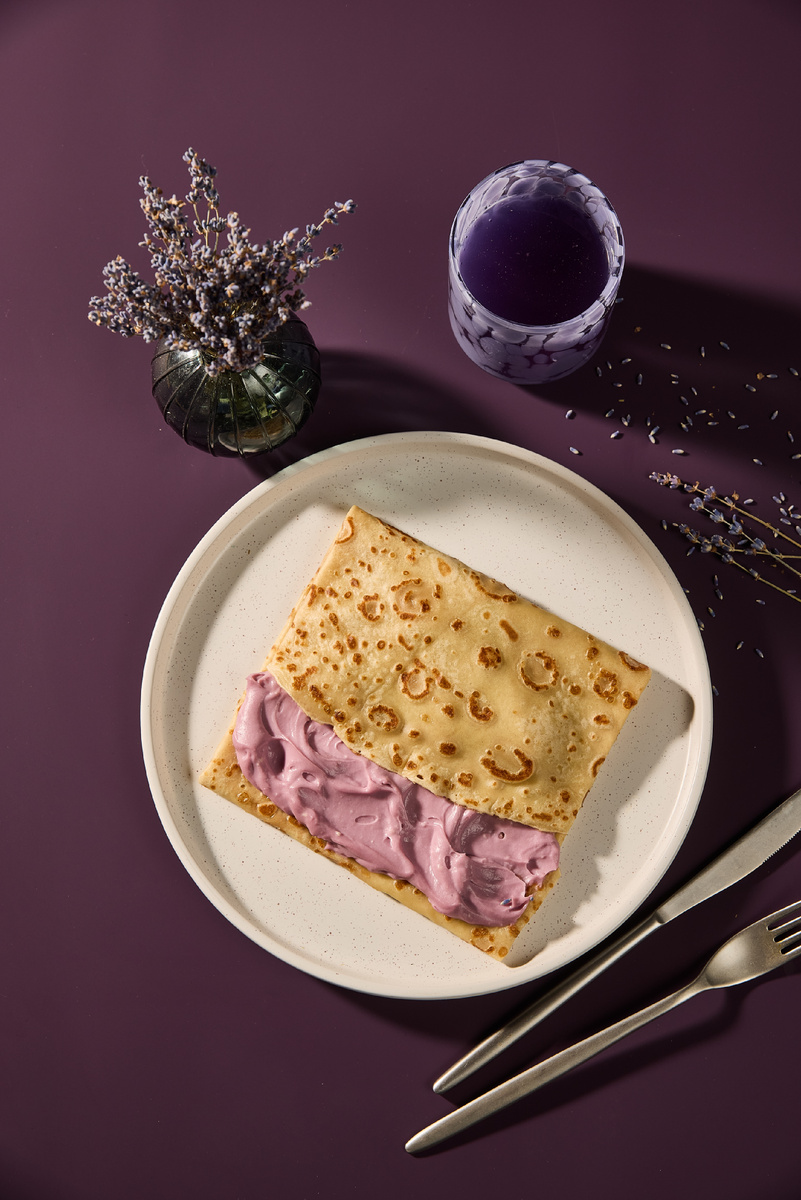 Тонкий горячий блин с шелковистым заварным кремом получается мягким и насыщенным, а натуральная лаванда добавляет цветочный оттенок и делает вкус более выразительным, сохраняя баланс и легкость.