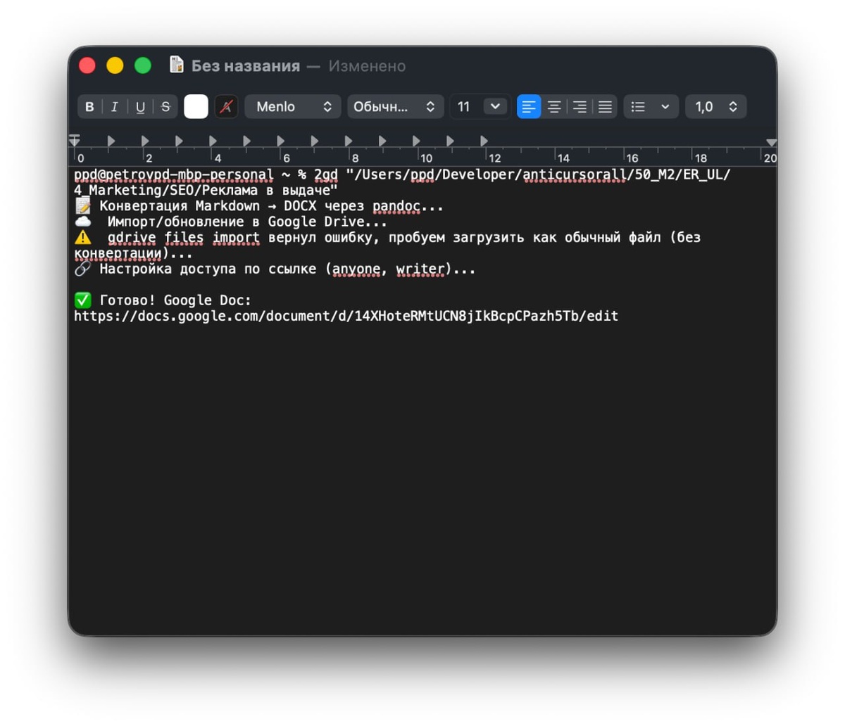 Сегодня утром отчаянно захотелось научиться быстро перегонять Markdown файлики (.md) в гугл документы... Последнее время половина работы у меня в .md, а делиться ими с командой и комментировать очень неудобно. Флоу выглядел так: 🔹Брат, курсор, хочу вот такую задачу сделать, какие варианты? 🔹Выбрал подходящее из предложенного 🔹Вместе с ним настроил гугл клауд 🔹Потестировал преедачу файликов 🔹Сделали, чтобы все форматировалось красиво 🔹Настроил команду на обратную передачу данных, если гуглдок менялся 💜💜 Профит 💜💜 🥺 А еще у меня есть несколько чатиков, где мы обмениваемся примерами задачек, промптами, новыми наработками, примерами использования и всякой такой штукой. Мы там это обсудили и поняли, что подобные материалы просто пропадают (((( а есть куча людей, которые может быть и хотели так же что-то пробовать... КРЧ. НАПИШИТЕ В КОММЕНТАХ ИЛИ В ЛИЧКУ, ЕСЛИ ВЫ НЕ РАЗРАБОТЧИК, НО ХОТИТЕ ИСПОЛЬЗОВАТЬ АИШКИ, не просто в формате «эй гпт, как зовут Канта», а ЧТОБЫ РЕАЛЬНО ПОМО