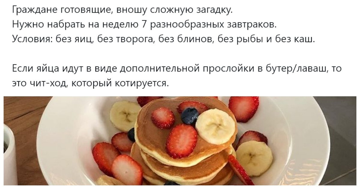 «Я как-то на завтрак борщ ела»: пользователи пытаются составить утреннее меню на неделю без яиц и каш