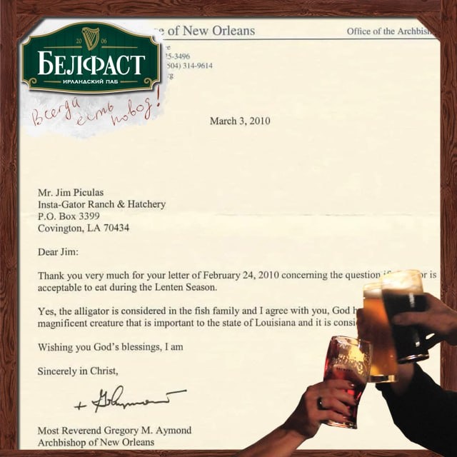 можно. Поскольку английское meat имеет достаточно широкое значение, опирались при этом на латынь, где мясом (carnis/caro) называется лишь мясо теплокровных, птиц и млекопитающих. Так что с точки зрения церкви крокодил это рыба. Имейте в виду. Ну, за чудеса творения! http://belfast-pub.ru #belfast_pub #паб #какмылюбим #естьповод #крокодил #мясо #пост