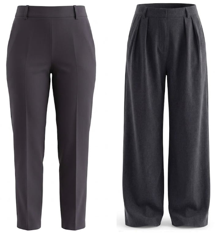 справа: брюки падают вниз отвесно, их ширина чуть шире прямых, они длинные. Будет ли фигура одинаково выглядеть в таких брюках? Возьмем нестандартную фигуру размера + с животом. Модель сгенерирована ИИ. Наденем на нее эти брюки Заметно, что фи