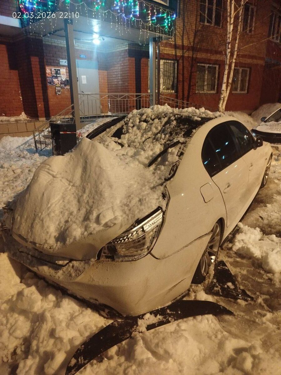 Лёд обрушился на автомобили во дворе жилого дома. Буквально за минуту до этого рядом проходила девушка с собакой.