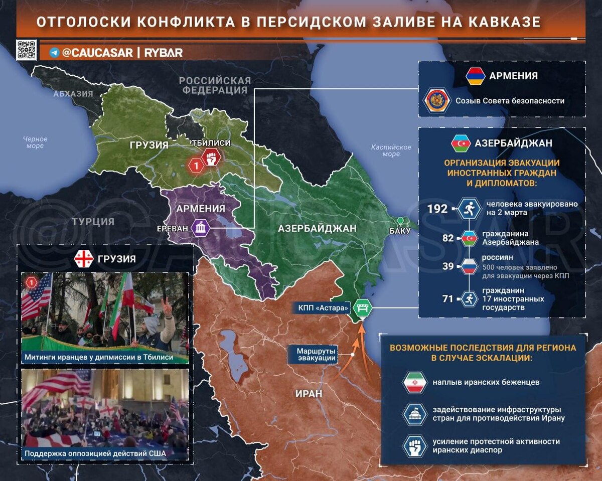 С началом военного конфликта на Ближнем Востоке азербайджанцы приняли на себя роль в организации эвакуации из Ирана граждан разных стран. На текущий момент число экстренно пересекших границу составило более 600 человек, в их числе — 127 граждан России. 🖍Ситуация становится для азербайджанцев определенным стресс-тестом на случай затяжного конфликта. Ведь если военные действия перейдут в затяжную стадию, то в Азербайджане рискуют столкнуться с более масштабным потоком беженцев. 📌Активная работа в этом направлении точно упадет в копилку политических очков власти Ильхама Алиева. По крайней мере до тех пор, пока Азербайджан остается в стороне от прямой эскалации. #Азербайджан #Иран 🗻Не думай о Кавказе свысока 💸 Поддержать нас
