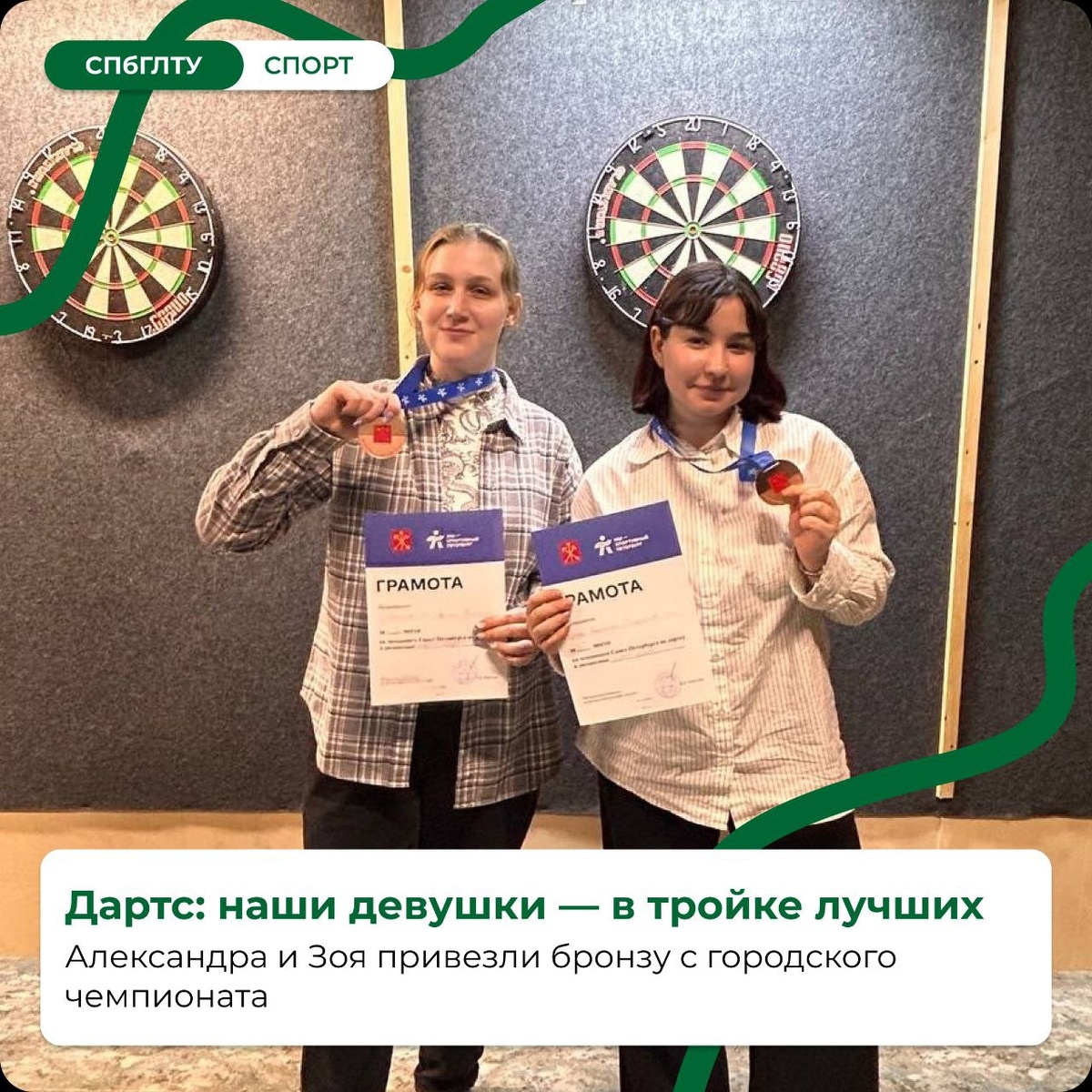 ! 28 февраля прошёл Чемпионат Санкт-Петербурга по дартс. Наши спортсменки Александра Брахно и Зоя Егорушкова завоевали бронзу в престижном турнире, проявив характер и волю к победе в борьбе с опытными соперницами! 🥉 В соревнованиях также приняли участие: • Алина Рязанова, Карим Ягудин — Институт химической переработки биомассы дерева и техносферной безопасности, 1 курс • Смирнов Андрей — Институт технологических машин и транспорта леса, 3 курс • Дарья Михайловна — Институт леса и природопользования, 1 курс Поздравляем наших спортсменов с достойным выступлением! Гордимся и желаем новых побед! 🐺💚 👉 Подробнее — на сайте СПбГЛТУ #СПбГЛТУ #СПбГЛТУ_спорт 👻 МАХ | 💙 ВК | 📝 ДЗЕН