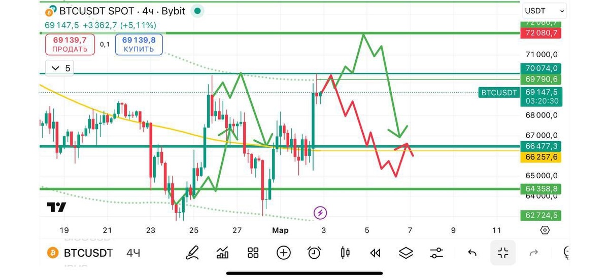 ? Рост или падение? Вот и началась у нас торговая неделя и ознаменовалась она ростом до 70 тысяч. Давайте разбираться, что ждать дальше по биткоину Итак, начнем с того, разворотной структуры, несмотря на то, что мы отскочили от 70 тысяч не сформировалось Если оценивать текущие шансы на рост или падение, то они равны между собой Если мы видим фиксацию над 69.5 тысячами, то полет биткоина до 71-72 тысяч с снятием ликвидности обеспечен Однако, если Азия нас сольет, то сходим вновь на 66 тысяч, где находится поддержка Помимо этого не забываем про новостной фон Ближнего Востока Внимательно следим 🧐