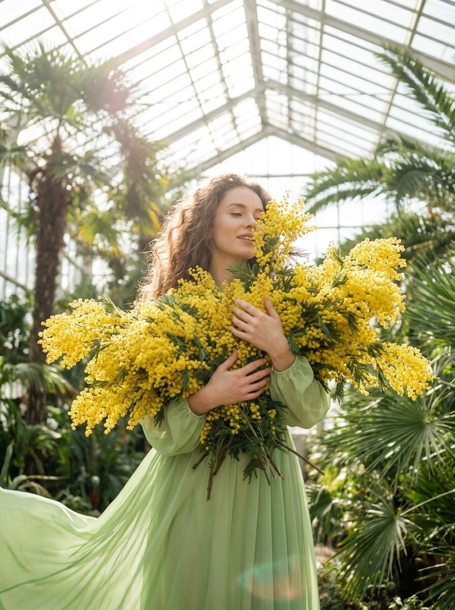 Промт ИИ весенняя фотосессия в стеклянной оранжерее с платьем цвета молодой зелени и огромной охапкой жёлтой мимозы