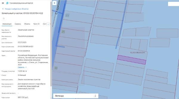 , Багаевский муниципальный район, Елкинское сельское поселение, х. Елкин, ул. Стадионная, 3/25 Канал: Госземля Ростовская область Область: обл Ростовская Российская Федерация Район: Ростовская область Населенный пункт: Багаевский муниципальный район, Елкинское сельское поселение, х. Елкин, ул. Стадионная, 3/25 Локация: Смотреть на карте ВРИ: Для ведения личного подсобного хозяйства (приусадебный земельный участок) Кадастровый номер: 61:03:0030154:422 Кадастровая стоимость: - Вид сделки: Аренда Площадь: 1500 м² Начальная цена: 28500.00 руб. Дата завершения: 13.03.2026 Подробнее: ГИС ТОРГИ #госземля #земляотгосударства #земля #земельныйучасток #земельныеторги #торги #аукцион #арендаземли #аренда #ростовскаяобласть