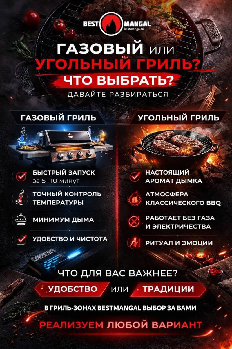 Уличную кухню с газовым, угольным или керамическим грилем можно посмотреть на нашем сайте: bestmangal.pro