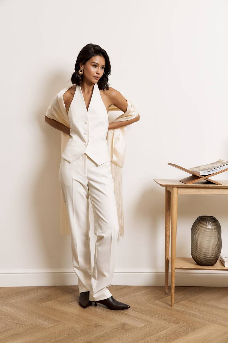 Приталенный жилет с V-образным вырезом на голое тело формирует чёткую вертикаль и добавляет графики, а прямые брюки со стрелками поддерживают эту линию, визуально вытягивая силуэт. Длинный шарф с бахромой делает образ визуально объёмнее и динамичнее, не перегружая его. Завершаем образ укороченными ботильонами из нашей новой весенней коллекции. Небольшой каблук формирует аккуратный подъём и делает силуэт собранным, а сама форма и дизайн модели не «утяжеляет» низ.