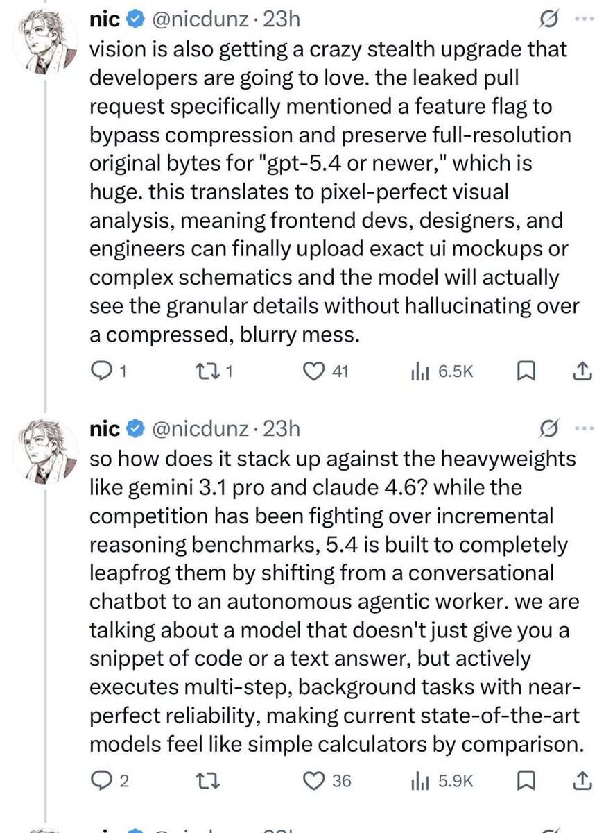 Похоже, вокруг GPT-5.4 начинает формироваться серьёзный шум. Вот что обсуждают в сообществе 👇 - 2M токенов контекста + persistent memory Это уже не просто «длинная история чата», а полноценная работа с огромными кодовыми базами, документами и агентными пайплайнами без постоянного перепромптинга. - Полноразмерная обработка изображений Модель якобы умеет работать с PNG, JPEG и WebP без понижения качества. Это критично для: - архитектурных чертежей - плотных UI-скриншотов - схем и графиков с мелким текстом - сложной технической документации Сохранение исходных байтов изображения = меньше потерь информации при анализе. - Новый speed-priority tier Отдельный класс скорости. Вероятно - для продакшена, агентов и real-time задач. Интересный момент - GPT-5.4 «засветился» в pull request’ах публичного репозитория Codex на GitHub. Упоминания быстро удалили force-push’ами, но скриншоты уже разлетелись. Prediction markets: - 55% шанс релиза до апреля 2026 - 74% шанс до июня 2026 Конкуренция