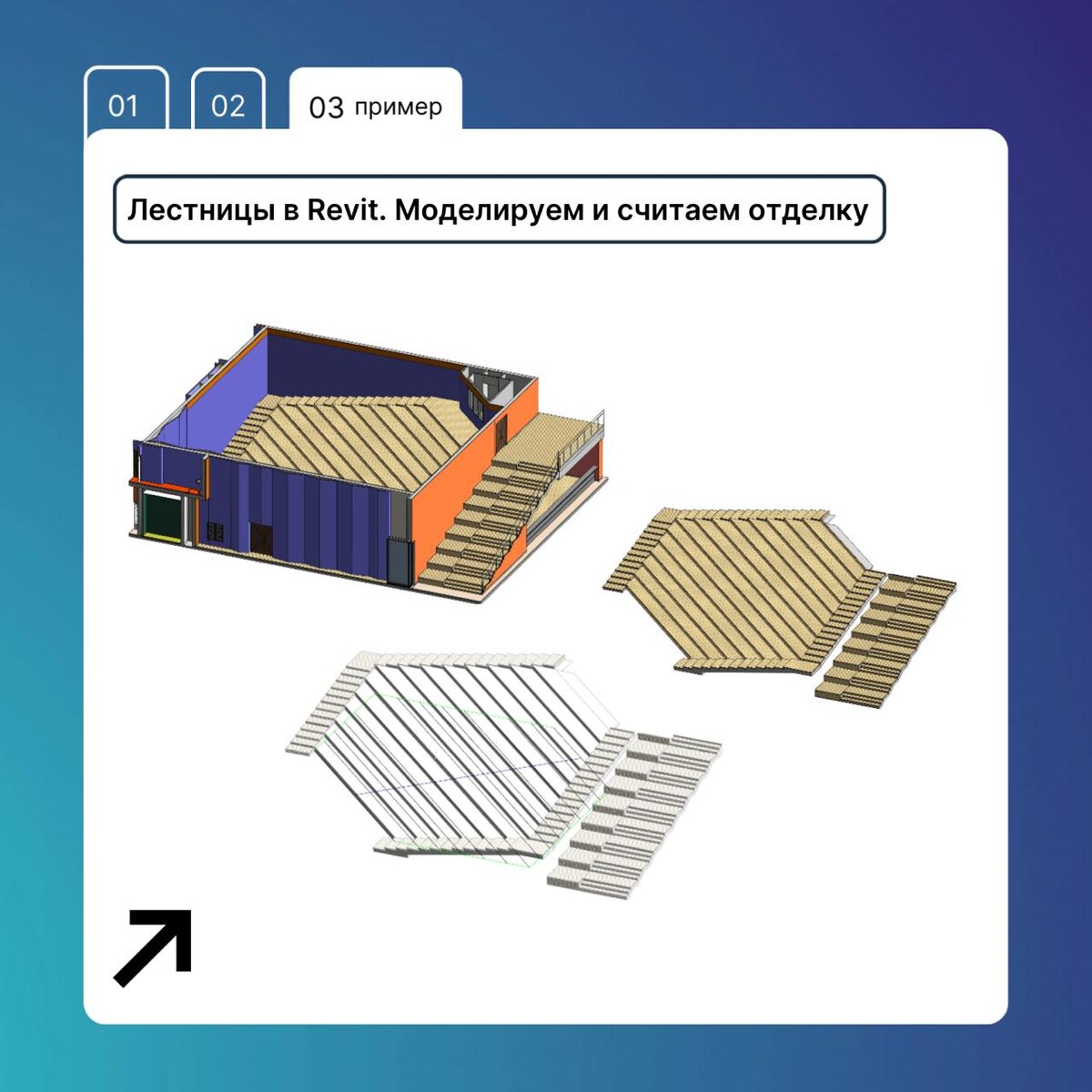 👀🔥 Показываем на примере лестницы в амфитеатре Студклуба. Конструкция состоит из 5 системных лестниц. Главную строим по эскизу, остальные — стандартными средствами. В типах задаём: 🟣толщину проступи 🟣толщину подступёнков 🟣материалы 🟣используем стандартные параметры ADSK, которые потом идут в экспликацию🔥 А площадь отделки как посчитать? Системным способом: делаем расчётную формулу! Делим объём материала отделки на толщину💪 Материал: Объем / ADSK_Размер_Толщина Метод работает при любой геометрии и автоматически обновляется при изменениях. Подробный разбор метода Дмитрий Дупак показывал на Просвете, посвящённом отделке ⌛️ FutureBIM News в MAX