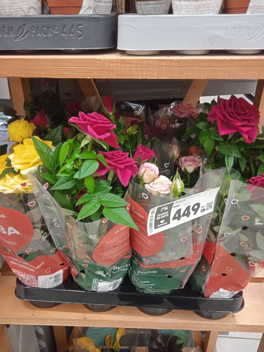 В этом году тюльпаны в сетевые магазины «Магнит», «Пятерочка» пока не завезли. В Магните цветов пока вообще нет. А вот в Пятерочке в продаже есть цветы в горшках. Роза кордана по цене 449,99 руб., орхидеи по цене 1299 руб.