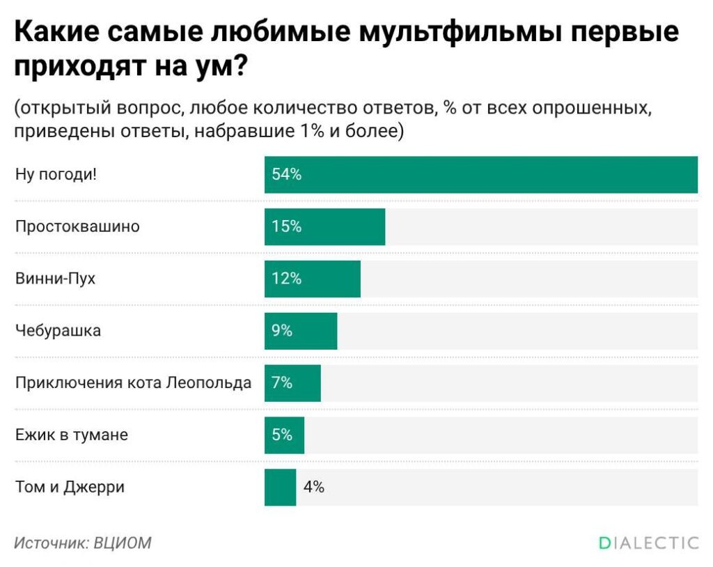 Абсолютное большинство граждан России предпочитают классическую отечественную анимацию современным и зарубежным картинам. Об этом сообщает Всероссийский центр изучения общественного мнения. Социологи провели опрос среди взрослых жителей страны в середине февраля. По итогам исследования 82% респондентов назвали своими любимыми рисованными историями произведения эпохи СССР. Около 80% граждан отдали предпочтение хитам студии Союзмультфильм. Безоговорочным лидером зрительских симпатий оказался сериал «Ну, погоди!» с результатом в 54% голосов. Вторую строчку заняла история про Простоквашино с 15%. Следом расположились Винни-Пух с 12% и Чебурашка с 9%. Пятерку главных хитов замкнули «Приключения кота Леопольда» с результатом в 7%. Зарубежная анимация преимущественно американского производства привлекает внимание лишь 11% опрошенных. Современные российские мультипликационные проекты получили поддержку всего 6% аудитории. При выборе любимой картины зрители чаще всего ориентируются на эмоционал