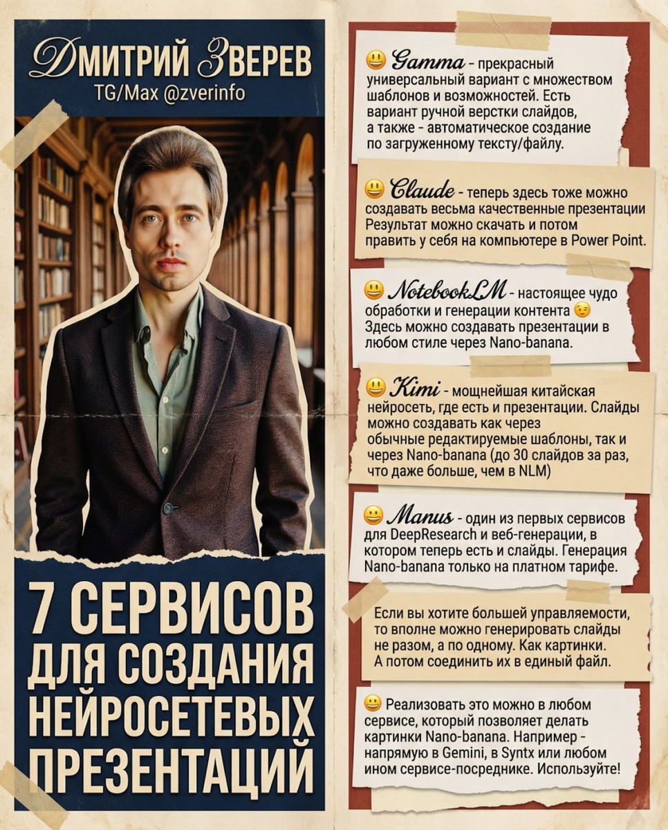 Список не исчерпывающий, конечно, но - вполне достаточный для полного погружения 😁 Есть вариант ручной верстки слайдов, а также - автоматическое создание по загруженному тексту/файлу. Преимущество в простоте и полной управляемости - любой слайд и элемент можно редактировать (в отличие от Nano-banana, к примеру) Доступен бесплатный тариф, работает без ВПН. Системе можно написать краткий промпт или дать полный текст, указать стиль и иные параметры, нейросеть активирует навык генерации слайдов и начнет работу. Результат можно скачать и потом править у себя на компьютере в Power Point. Есть бесплатный тариф, работает с ВПН. Здесь можно создавать презентации в любом стиле через Nano-banana. Стиль прописывается в промпте. Создаются просто потрясающие вещи, но есть проблема: слайды генерируются как картинки и по-простому каждый элемент изменить, заменить или передвинуть нельзя (хотя - в этом направлении уже есть подвижки и появился встроенный редактор с некоторыми базовыми возможностями пере