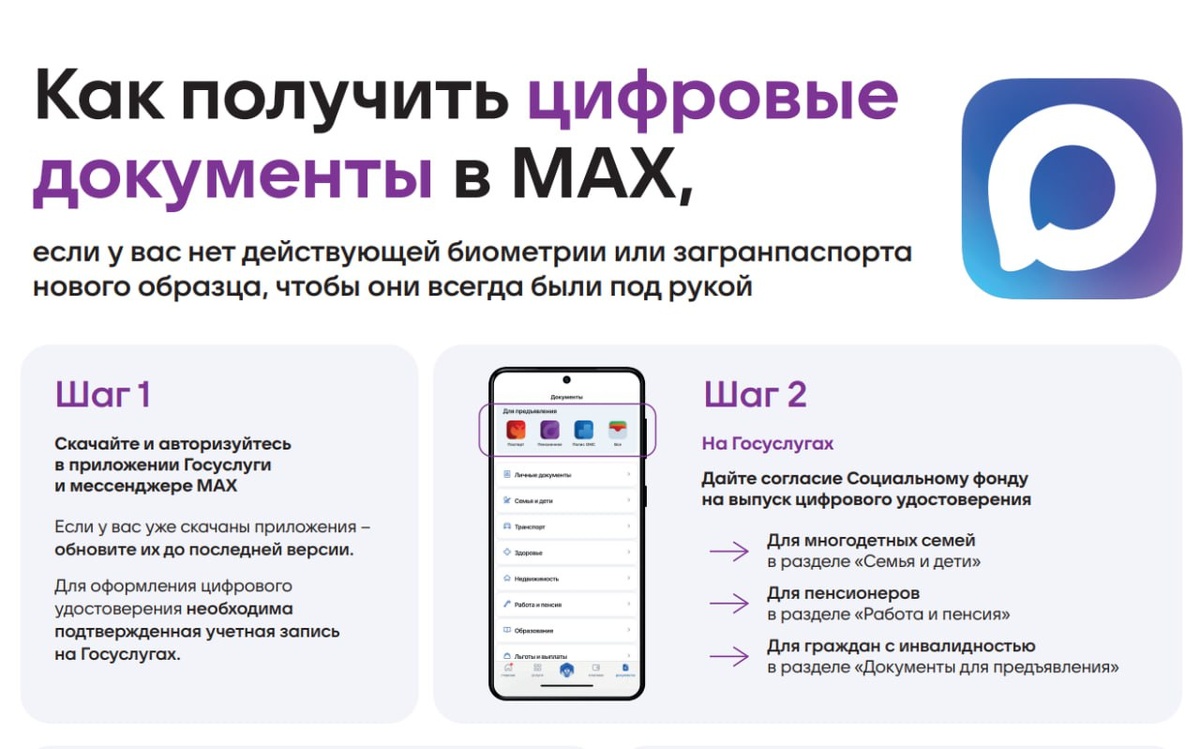💁♀️ Подтверждать совершеннолетие, статус многодетного, пенсионера или студента стало удобнее. Добавьте документы с Госуслуг в Цифровой ID в Мах и используйте их QR-код наравне с бумажными аналогами. Как подключить функцию 1. Обновите приложение Мах; 2. Перейдите в раздел Цифровой ID; 3. Нажмите «Добавить документы» и авторизуйтесь через Госуслуги; 4. Дайте разрешение на обработку данных в Госуслугах. Безопасность данных Цифровой ID невозможно передать или продать другому человеку — сервис действителен только на том устройстве, на котором он создавался; для создания Цифрового ID нужна подтверждённая учётная запись Госуслуг; при сканировании QR-кода персональная информация пользователя, в том числе дата его рождения, недоступна; динамический QR-код обновляется каждые 30 секунд; сделать скриншот Цифрового ID невозможно — вместо QR-кода на фото будет белый экран.️ ✅ Электронные документы действуют наравне с бумажными, использовать их можно по желанию.