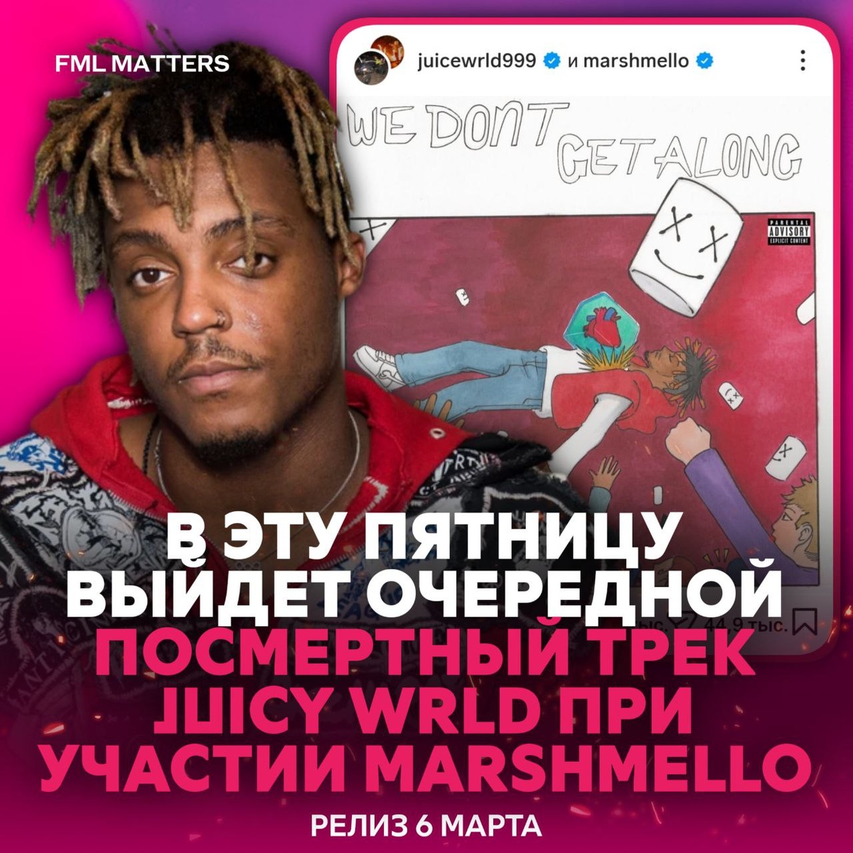 ! В эту пятницу выходит очередной посмертный трек — «WE DON'T GET ALONG» при участии Marshmello. Посмертные альбомы, фиты, демки, даже телефоны с анрелиз треками — индустрия продолжает монетизировать наследие Джуса. Мнение? 💀 FML MATTERS